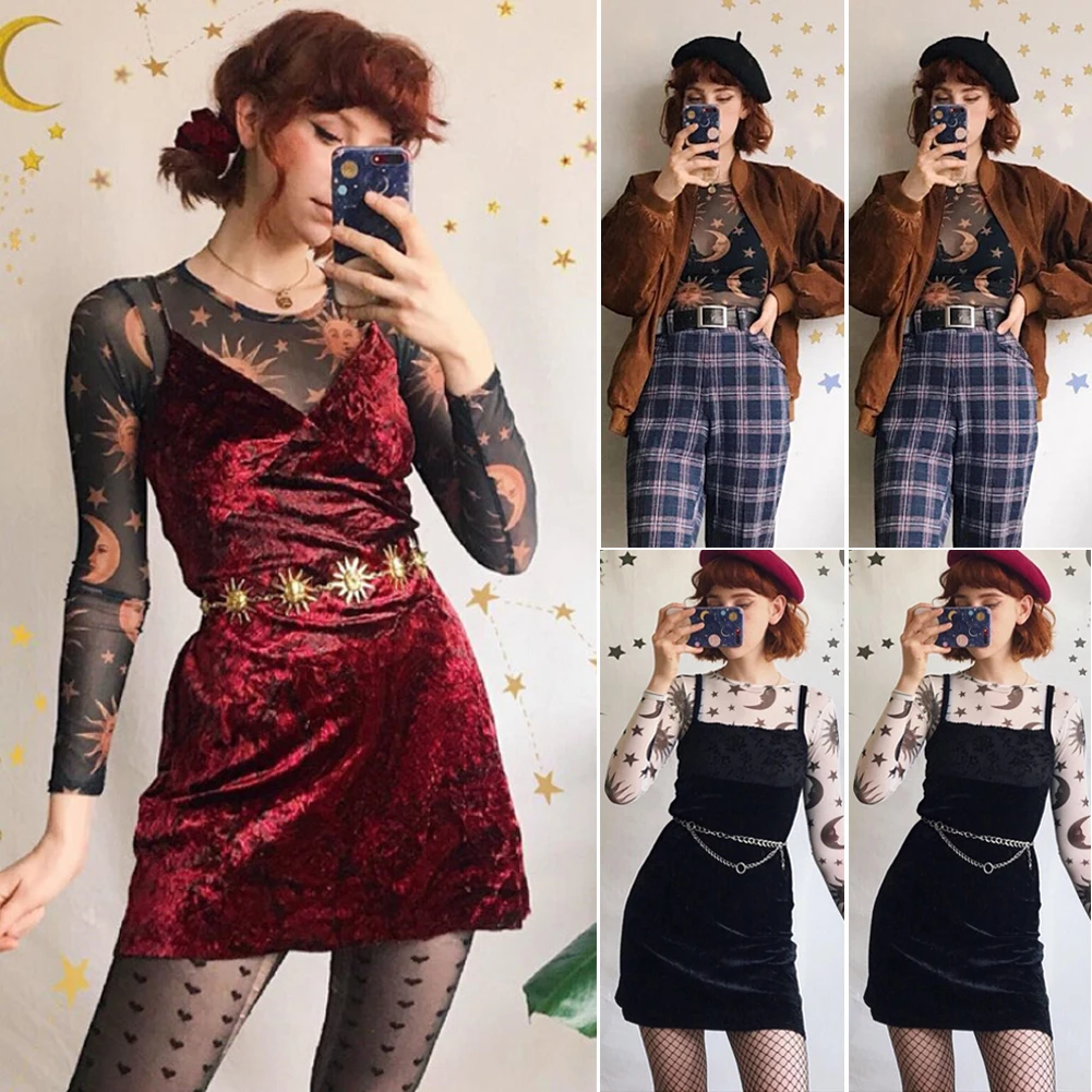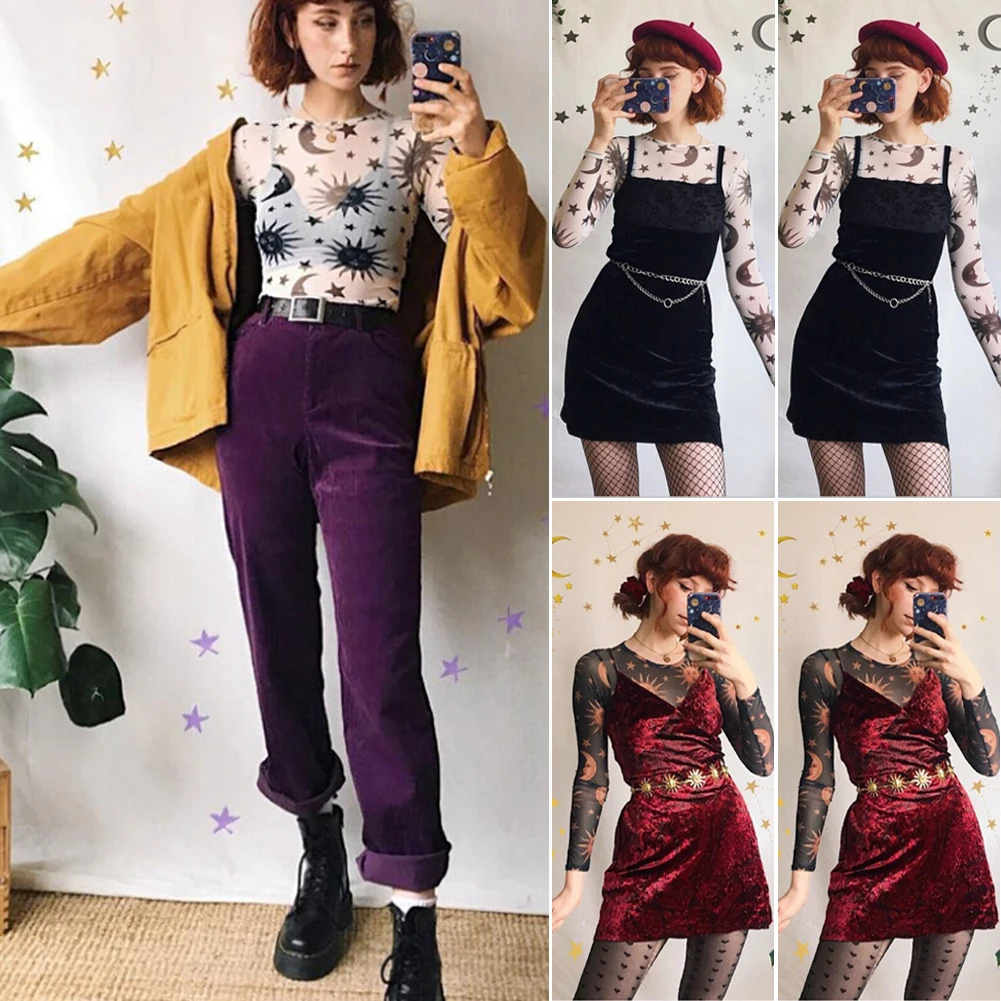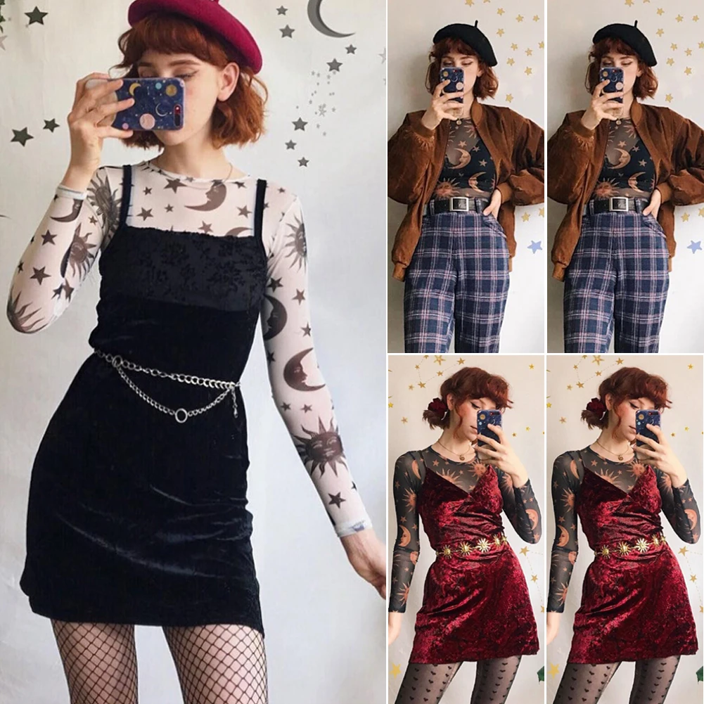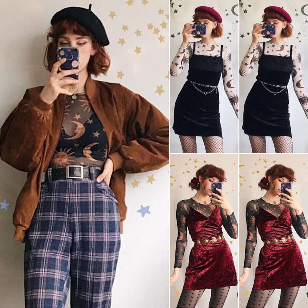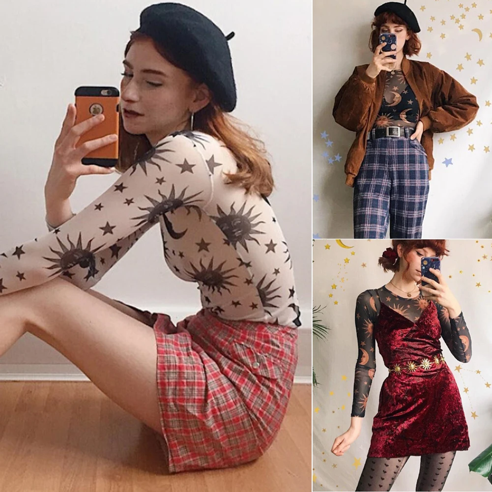 Сексуальные женские прозрачные сетчатые кроп-топы с принтом Sun Moon, черно-белые тонкие женские футболки с длинными рукавами и круглым вырезом