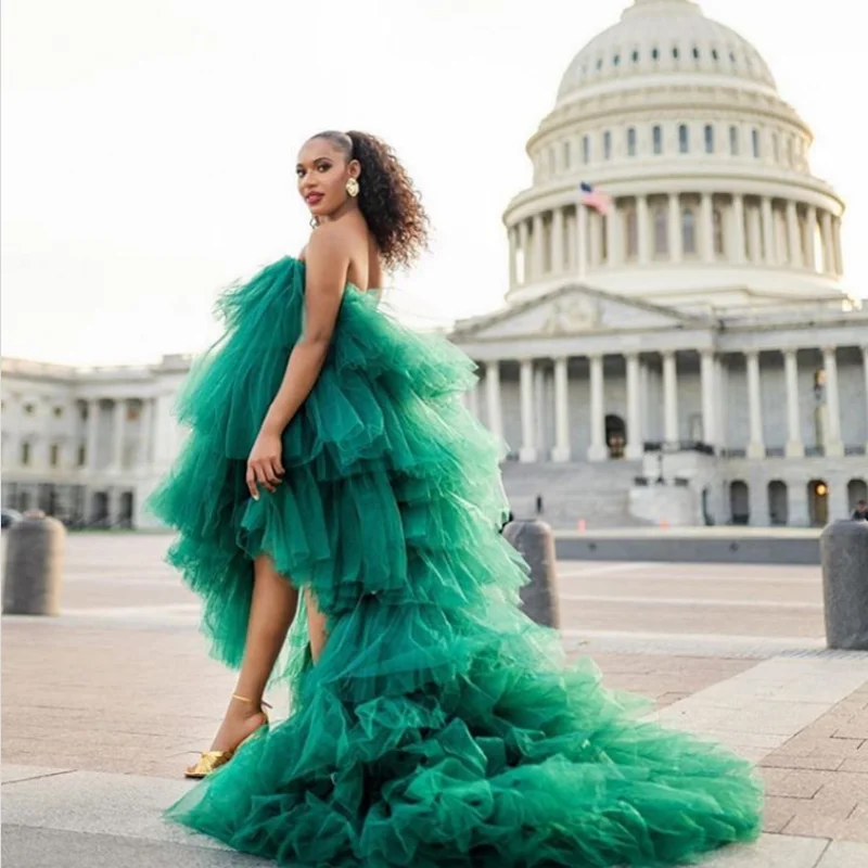 Модное Африканское женское платье из тюля, платья для выпускного, темно-зеленые платья с оборками в несколько рядов, без бретелек, со шлейфом, платья для гостей свадьбы, платье для вечеринки