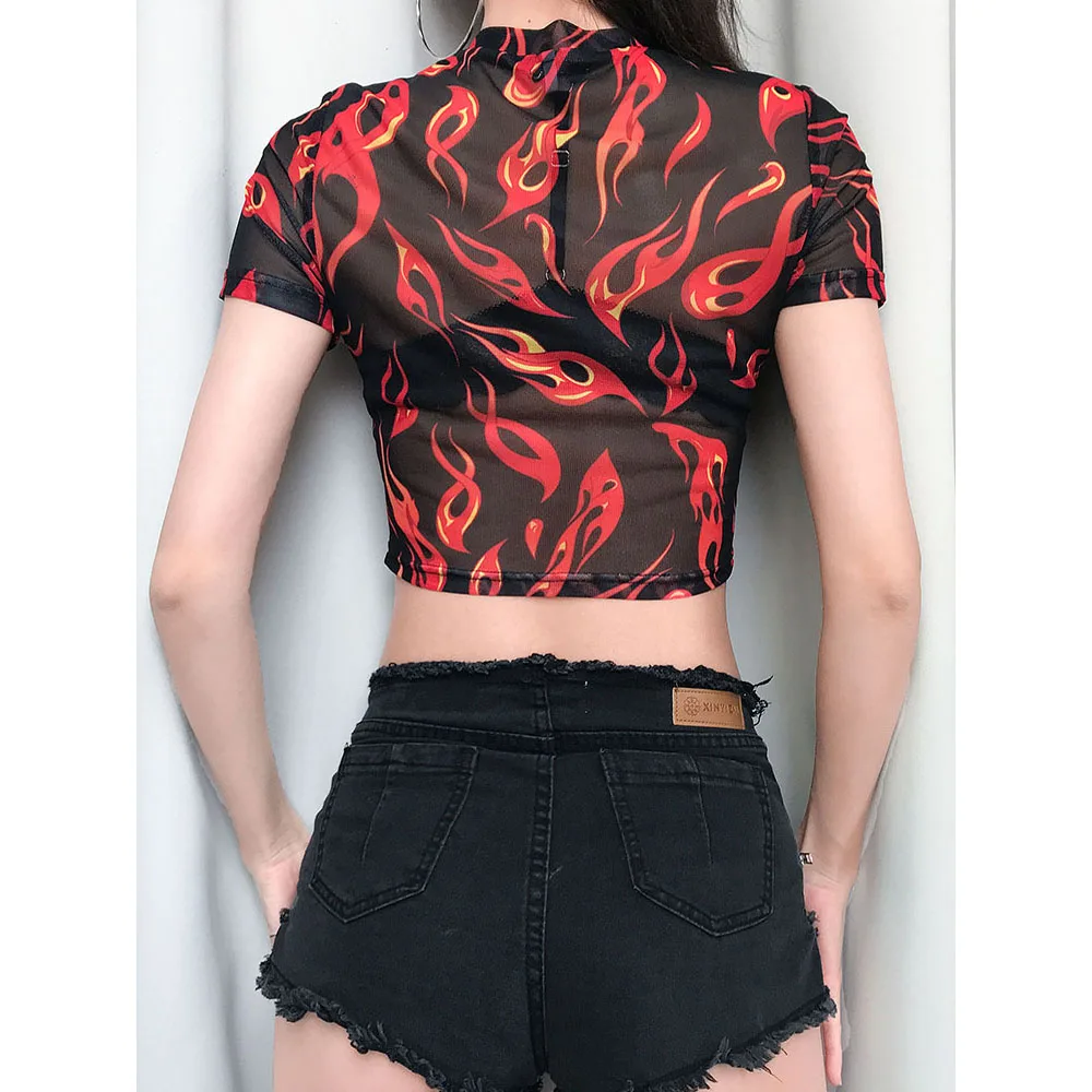 Сексуальная летняя женская футболка с коротким рукавом и круглым вырезом, прозрачная Сетчатая футболка с принтом ангела и пламени