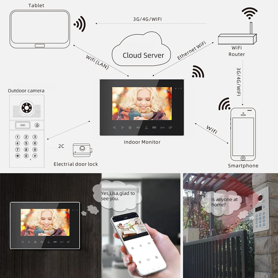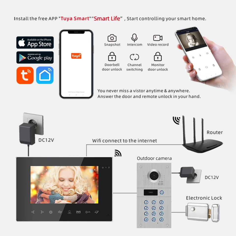 ♦Поддержка смартфона iOS и Android с помощью приложения Tuya smart.♦Цифровая система, 4 провода кабельного подключения.♦2-полосная связи между внутреннего и наружного блока. Поддержка 2 способ связи между мониторами.♦1.3MP камера, широкий угол обзора.♦Когда кто-то звонит на улице, ваш монитор и смартфон будут звонить одновременно.♦Голосовое сообщение и обнаружение движения, поддерживаемая домашняя система сигнализации, может добавить 8 зон безопасности сигнализации (например: датчик дыма, газовый датчик, датчик PIR... и т. Д.)♦WIFI включен или проводной маршрутизатор.