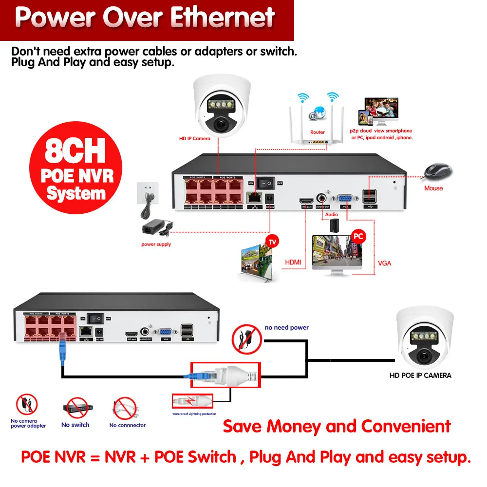 Нет дополнительных кабелей питания или адаптеров, просто подключив ip-камеру к NVR с помощью одного кабеля, вы можете легко завершить установку без знания о компьютере или сети и начать наслаждаться супер простым мониторингом среди вашего смартфона, планшета или ПК.
