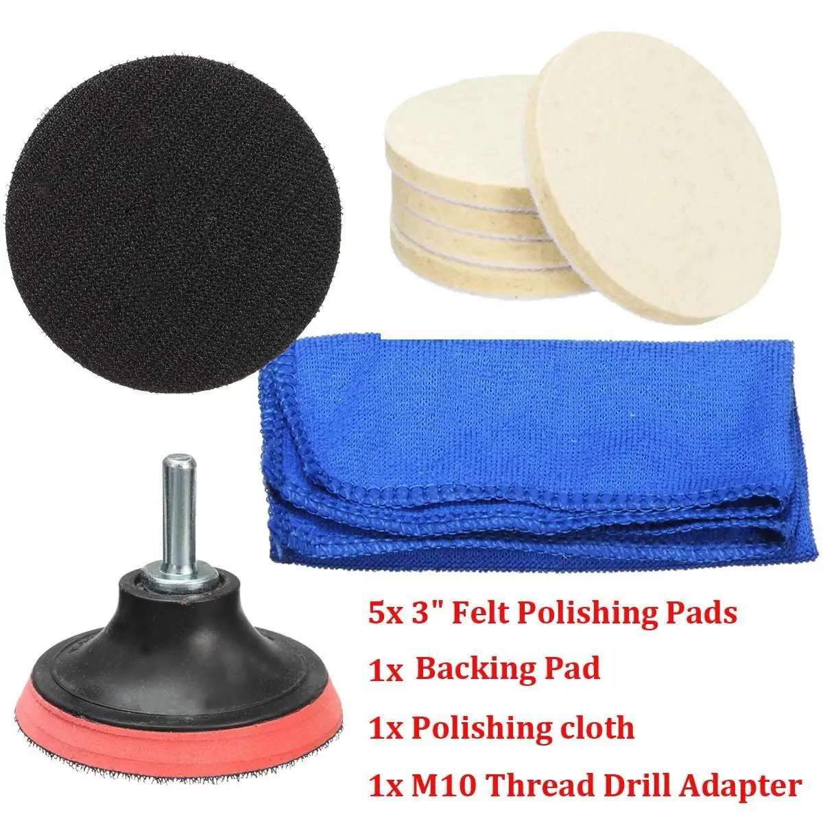 Технические характеристики:Размер подкладки: 75 мм/3 дюймаИскусственный Войлок Размер полировки: 75 мм/3 дюймаРазмер полировальной ткани: 28 мм * 28 ммРазмер адаптера резьбы:45 мм (длина) * 10 мм (диаметр резьбы) * 8 мм (диаметр хвостовика)