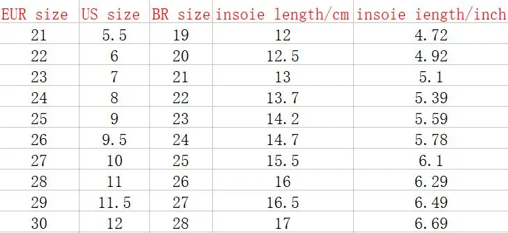 Примечание: Американские размеры не соответствуют стандартным размерам. Американский размер только для покупателей, чтобы купить. Покупатели в соответствии с евро/см покупают правильную обувь. Длина стельки = детская длина стопы + 1 см, вы можете + 1,5 см в том случае, если ваши дети у вас полная нога Все замеры производятся вручную, допускается отклонение 0,5-2 см вследствие измерений вручную 1 дюйм = 2,54 см