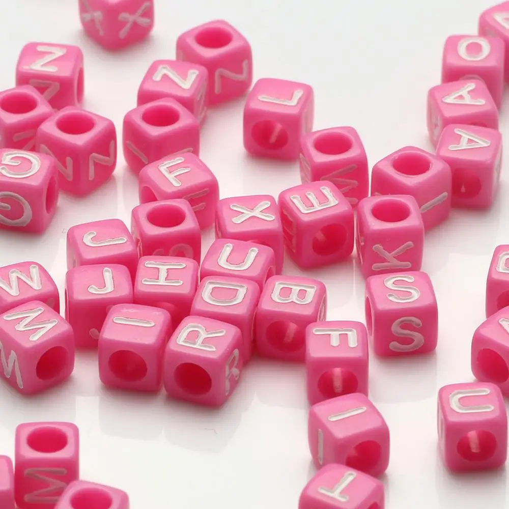100 шт. куб 26 букв алфавита розовые акриловые бусины с белыми буквами для девочек Свободные Spacer Бусины для изготовления ювелирных изделий Diy для женщин детей браслеты 6X6MM