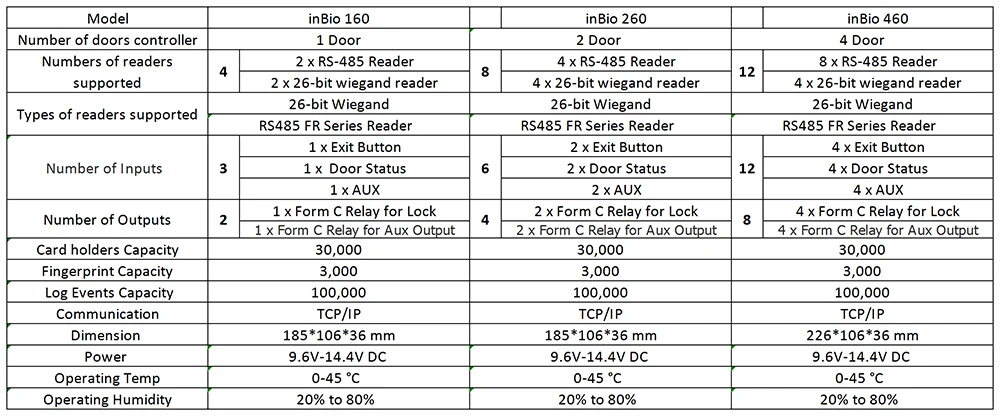 Инбио осуществляет сопоставление отпечатков пальцев на панелях. Читатели серии FR передают шаблоны отпечатков пальцев в InBio через RS-485 для быстрого и точного соответствия шаблонам, хранящимся в базе данных. Контроллеры InBio легко устанавливаются в вашей сети и поддерживают связь как TCP/IP, так и RS-485. Инструмент автоматического обнаружения позволяет настраивать и изменять параметры сети напрямую и легко. Прошивка контроллера InBio может быть обновлена в полевых условиях. Хранит до 3000 шаблонов отпечатков пальцев, 30000 пользователей карт и до 100000 событий и транзакций. Контроллер резервируется в режиме реального времени на бортовой SD-карте. Данные сохраняются при потере питания. Инбио продолжает впадать, если соединение сети прервано. Наряду с релейными контактами для управления дверными замками, легко программируемые вспомогательные реле используется для дополнительного управления и интерфейса для освещения, сигнализации, сигнализаторов, панелей обнаружения вторжений или даже дополнительных запирающих устройств или контроллеров ворот. Контроллеры InBio поставляются в трех размерах, чтобы удовлетворить потребности проекта и снизить стоимость неиспользованной емкости. Модели с 1 дверью, 2 дверью и 4 дверями могут смешиваться и сочетаться с оптимизированной системной архитектурой. Анти-проход, открытие первой карты, открытие нескольких карт, ввод пароля принуждения и вспомогательные Входные/выходные связи встроены в прошивку контроллера. Бесплатный SDK доступен для интеграторов и OEM для интеграции контроллеров InBio с их или существующими приложениями безопасности или управления персоналом. По запросу, также можно настроить прошивку InBio для удовлетворения любых пользовательских требований.