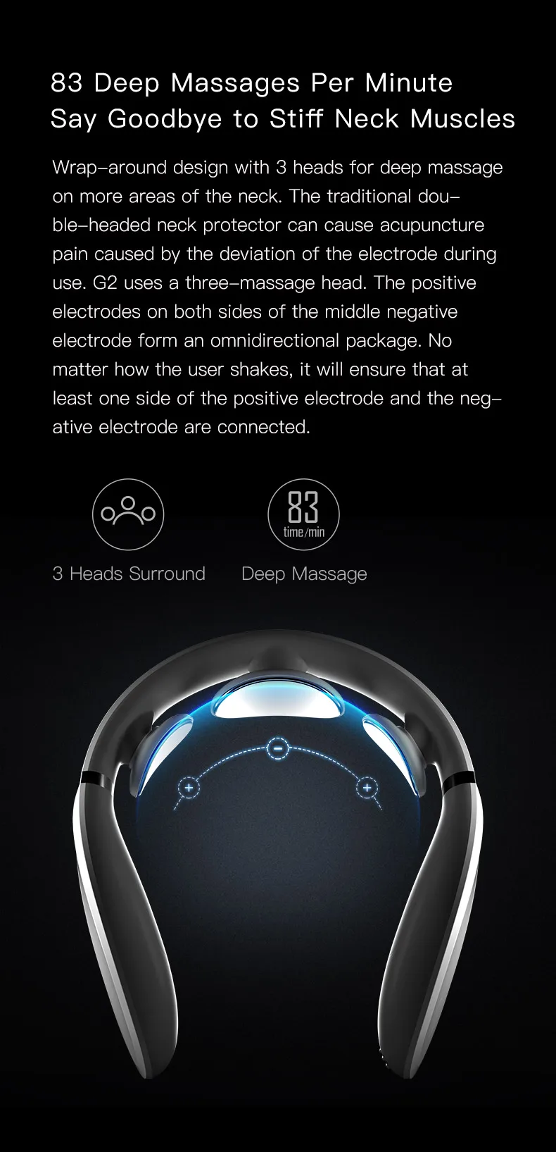 Оберните вокруг дизайн с 3 головками для глубокого массажа на больших областях шеи. Традиционная двуголовая защита шеи может вызвать акупунктурную боль, вызванную отклонением электрода во время использования. G2 использует трехмассажную головку. Положительные электроды с обеих сторон среднего отрицательного электрода образуют всенаправленную посылка. Независимо от того, как пользователь трясется, это гарантирует, что по крайней мере одна сторона положительного электрода и отрицательного электрода подключены. ● 3 головки окружают ● глубокий массаж