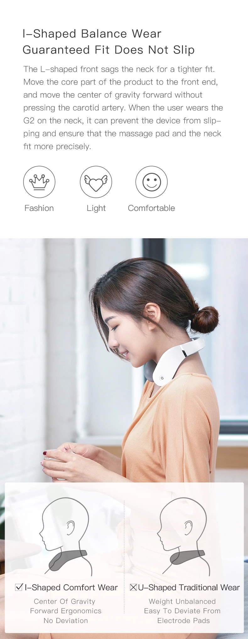 L-образная передняя часть пристегивает шею для более плотного прилегания. Переместите основную часть продукта на передний конец и перемещайте центр тяжести вперед, не нажимая на сонную артерию. Когда пользователь носит G2 на шее, он может предотвратить скольжение устройства и обеспечить более точное прилегание массажной накладки и шеи. ● Модный ● светильник ● удобный