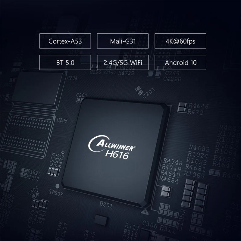 1. Четырехъядерный процессор Allwinner H616 ARM Cortex A53;2.GPU:G31 OPenGL3.2;3. ОС Android 10,0;4. RAM/ROM: 4G/32G, 4G/64G;5. Поддержка H.265, 6K, 4K, HDR, HD2.0, 1xUSB2.0,1xUSB3.0;6. Поддержка 10/100M Ethernet, 2,4G и Wi-Fi 5 ГГц двухъядерный процессор Wi-Fi;7. Поддержка обновления прошивки онлайн (OTA).