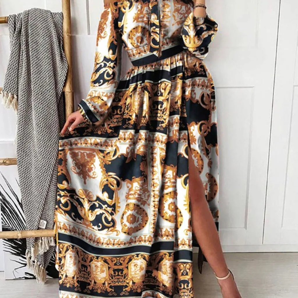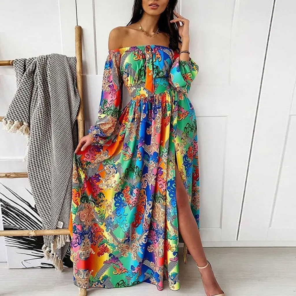 Женское Платье с открытыми плечами, осеннее Платье макси с разноцветным принтом, с длинным рукавом и разрезом