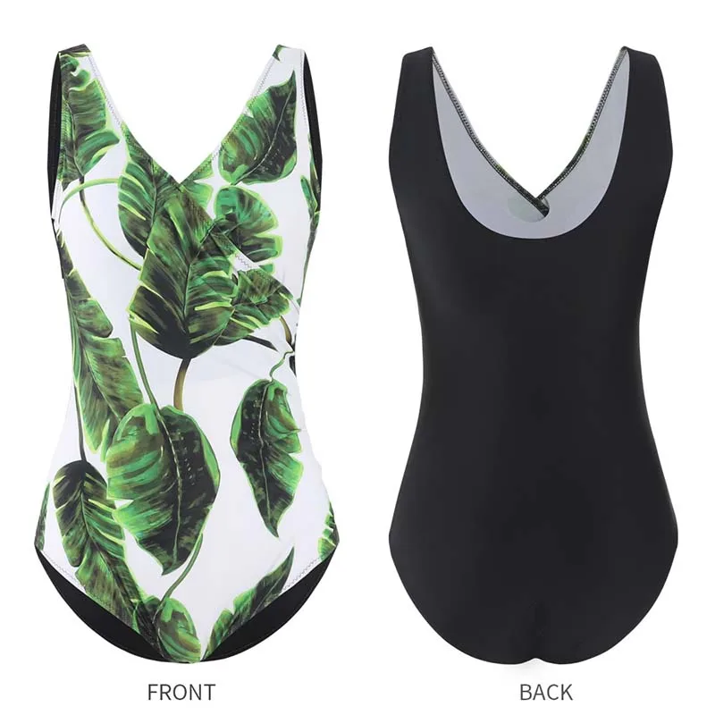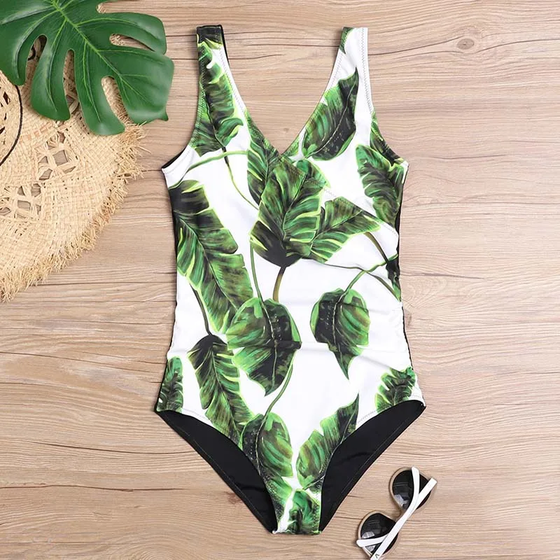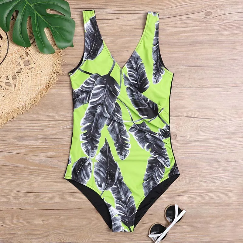 Женский закрытый купальник, Цельный купальник с принтом листьев, ра...