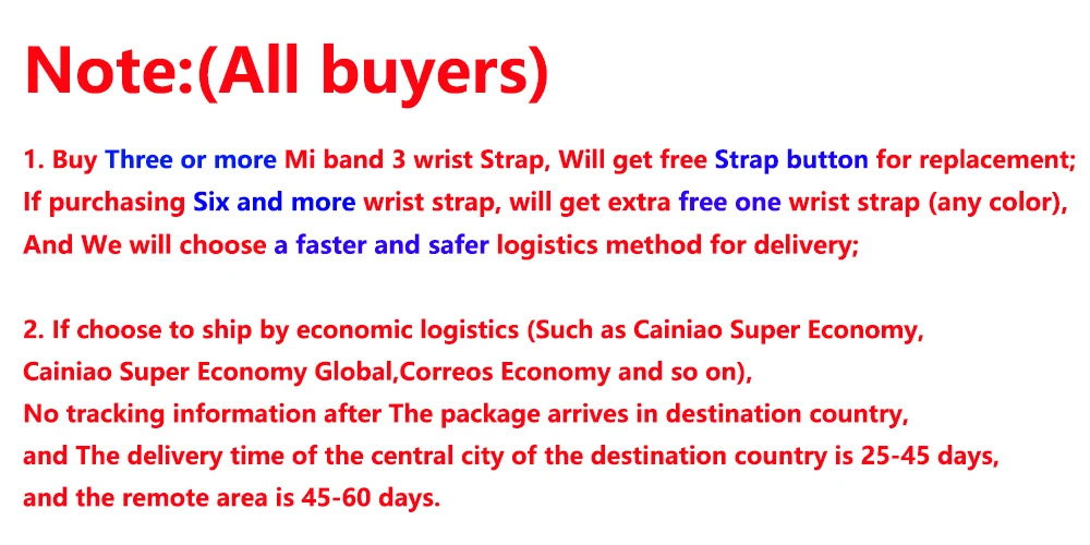 Примечание: (все покупатели)1. Купите три или более ремешков на запястье Mi band 3 4 и получите бесплатную кнопку на запястье для замены; При покупкеШесть и более ремешков на запястье, получите дополнительный ремешок на запястье (любого цвета), также сообщите мне желаемый цвет;2. Если вы выберете отправку эконом-логистикой (например, Cainiao Super Economy,Cainiao Super Economy Global,Correos Economy и др.), информация об отслеживании отсутствует после того, как посылка прибудет в страну назначения, время доставки в центральный город страны назначения составляет 25-45 дней, а в отдаленный регион-45-60 дней.3. Если вы хотите получить товары быстрее и получить лучшее обслуживание, пожалуйста, выберите доставку стандартной или простой логистикой (например, AliExpress Saver,AliExpress standard, Почта Китая, Singapore Post и так далее), срок доставки 15-30 дней.4. Это просто силиконовый браслет на запястье для Xiaomi band 3 4, не включает ремешок для часов, пожалуйста, внимательно прочтите перед размещением заказа.Русский Друг:Обратите внимание! --Пожалуйста, укажите полное имя получателя в связи с новой политикой российской таможни, спасибо!-Пожалуйста, заполните полное имя получателя в связи с новой политикой таможенного оформления, спасибо! Описание1. Новый ремешок на запястье mi band 3 4, ремешок на запястье mi band 3 42. Носимый браслет/ремешок для XIAOMI MI band 3 43. Хорошая замена цвету вашего браслета4. Доступны 20 различных модных цветов на выбор.5. Легко и просто, приятно носить на коже6. Изготовлен из высококачественного силиконового материала, обладает хорошей эластичностью и мягким материалом.7. Водонепроницаемость IP54, вы можете использовать его хорошо даже при мытье рук.Посещение:(1) Пожалуйста, хорошо знайте, что это только ремешок для Xiaomi band 3 4, красочный ремешок на ваш выбор, это ремешок в стиле 1:1 для фитнес-браслета miband 3 4, модный ремешок для вашего здоровья.(2) при заказе, пожалуйста, оставьте нам сообщение с желаемым цветом, иначе мы отправим товар произвольно. Спасибо.