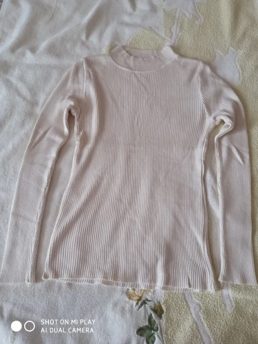 Водолазки нам понравились, приятные на ощупь, мягкие, не очень толстые. Заказывала две для племянниц 11-12 лет, по размеру как раз. Белая чуть больше по размеру, чем абрикосовая, но снять на фото не успела, одну сразу забрала племянница. Они немного просвечивают, особенно белая.