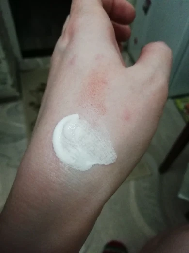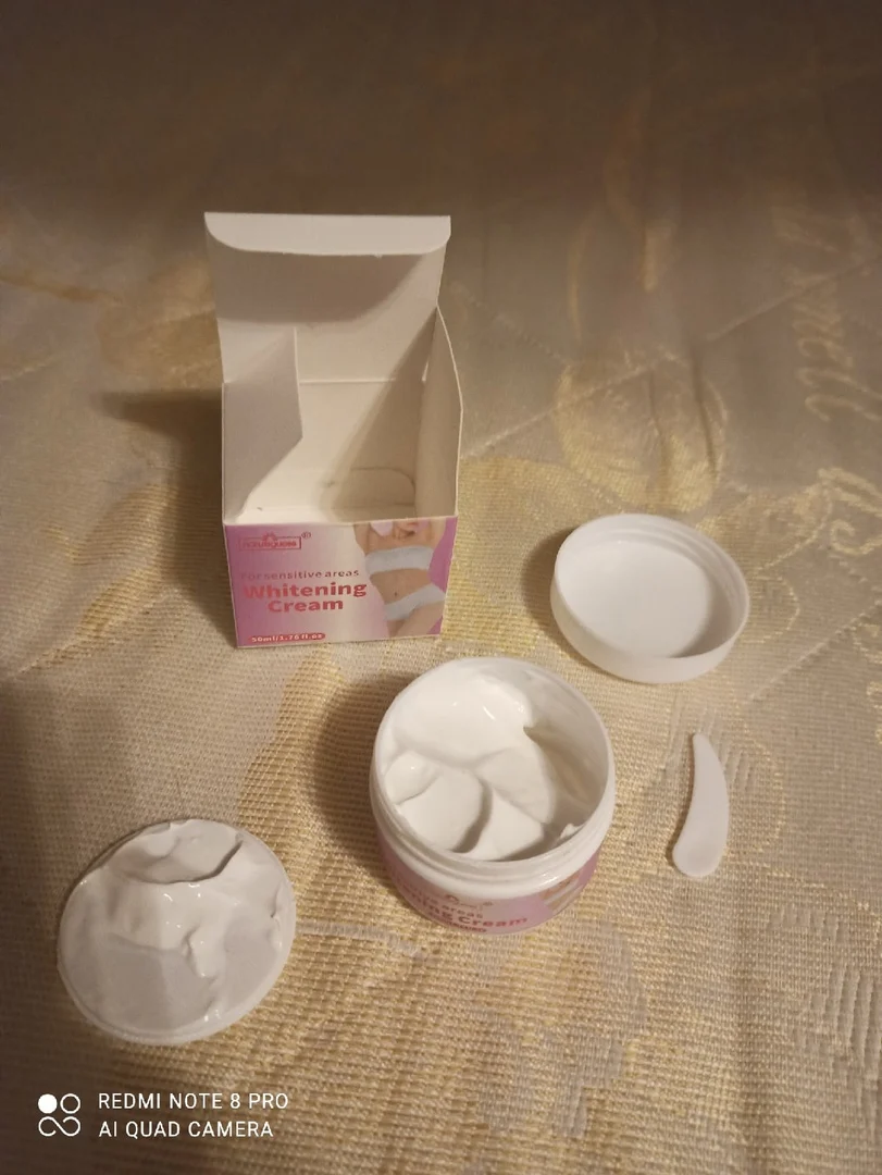 Товар прибыл быстро, хорошо упакован. Крем хорошо пахнет, и из того, что он применяется, вы можете немного увидеть отбеливание также не раздражает.