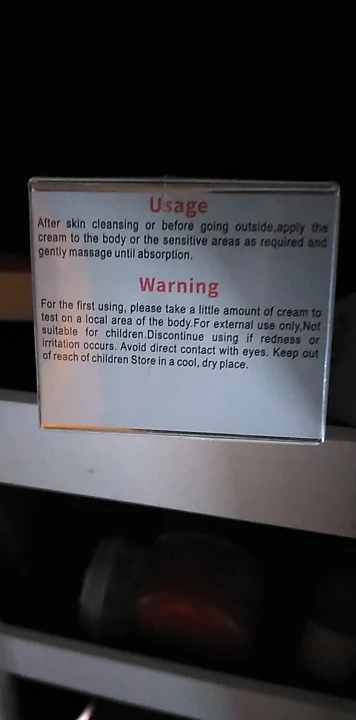 Быстрая доставка в соответствии с описанием продавца Инструкции и использование После очистки кожи или перед тем, как выйти, нанесите крем на тело или чувствительные участки в соответствии с потребностями и слегка массаж до поглощения. Для первого использования Возьмите небольшое количество крема, чтобы проверить на местной области тела. Для внешнего использования только не подходит для детей. Перестает использовать, если покраснение или раздражение происходит. Избегайте прямого контакта с глазами. Держится за пределы досягаемости детей и хранится в прохладном и сухом месте.