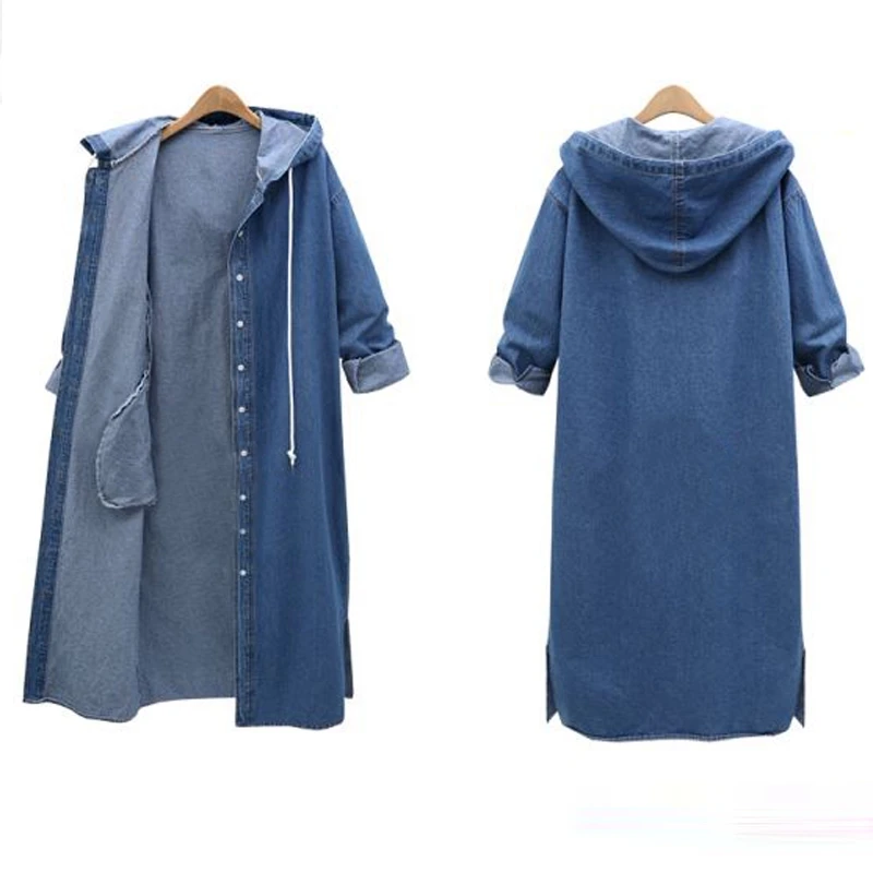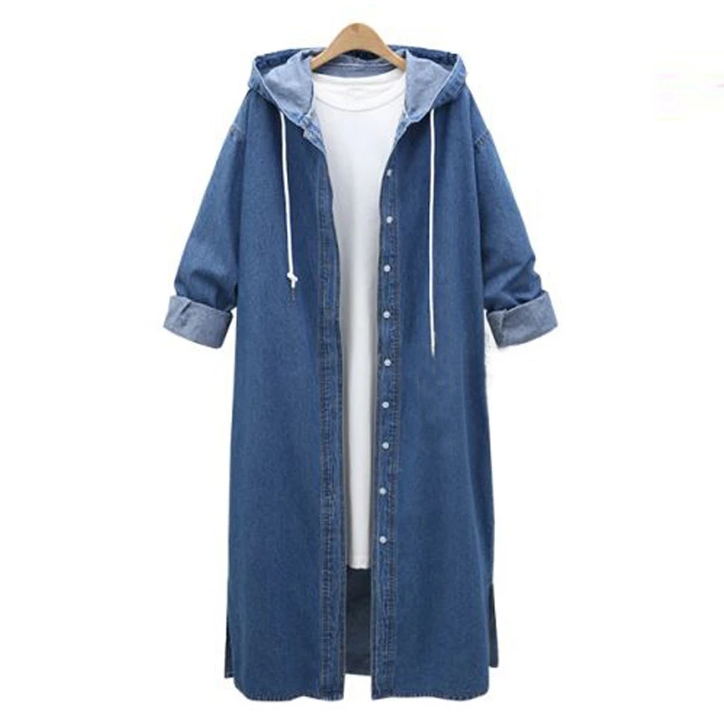 Куртка женская джинсовая с капюшоном, модная Свободная Повседневная Длинная Верхняя одежда из денима, на пуговицах, пальто