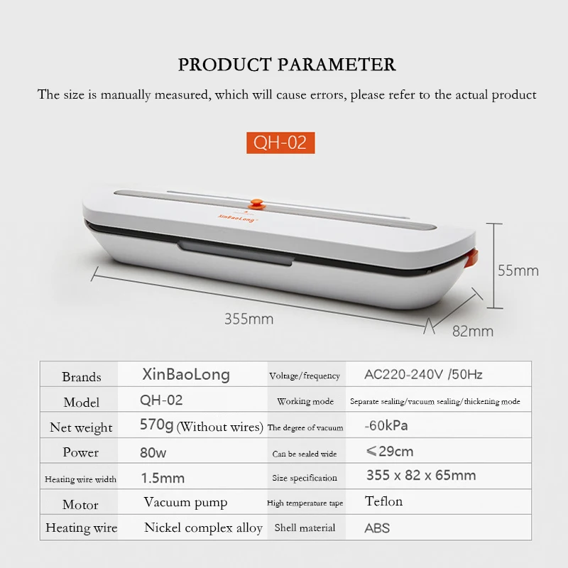 Модель: QH-02Напряжение/частота: AC220-240V /50 ГцМощность: 80 ВтСтепень вакуума: -60 кПаШирина герметизации: ≤ 29 смНагревательная Проволока ширина: 1,5 ммРазмеры: 355*82*65 ммДвигатель: вакуумный насосВысокотемпературная лента: тефлонНагревательная проволока: никелевый сложный сплавМатериал корпуса: АБС-пластик