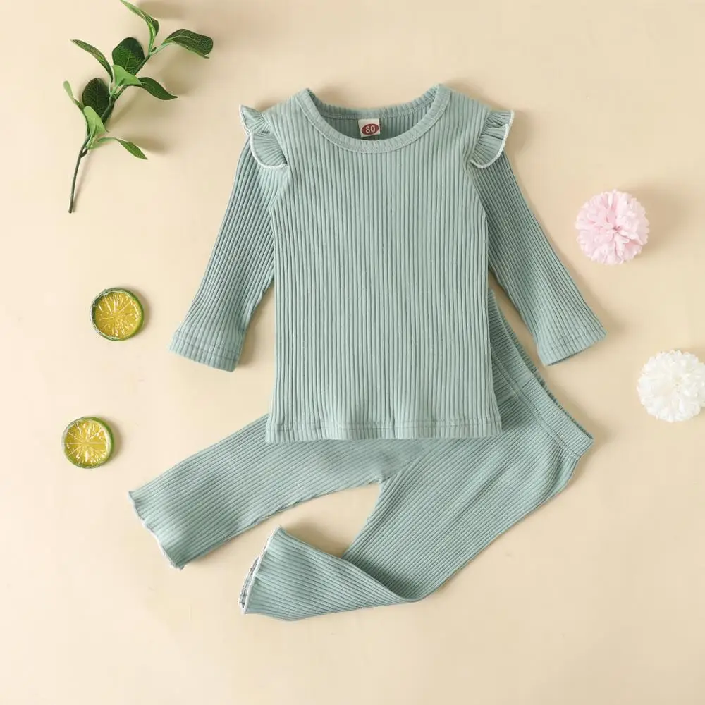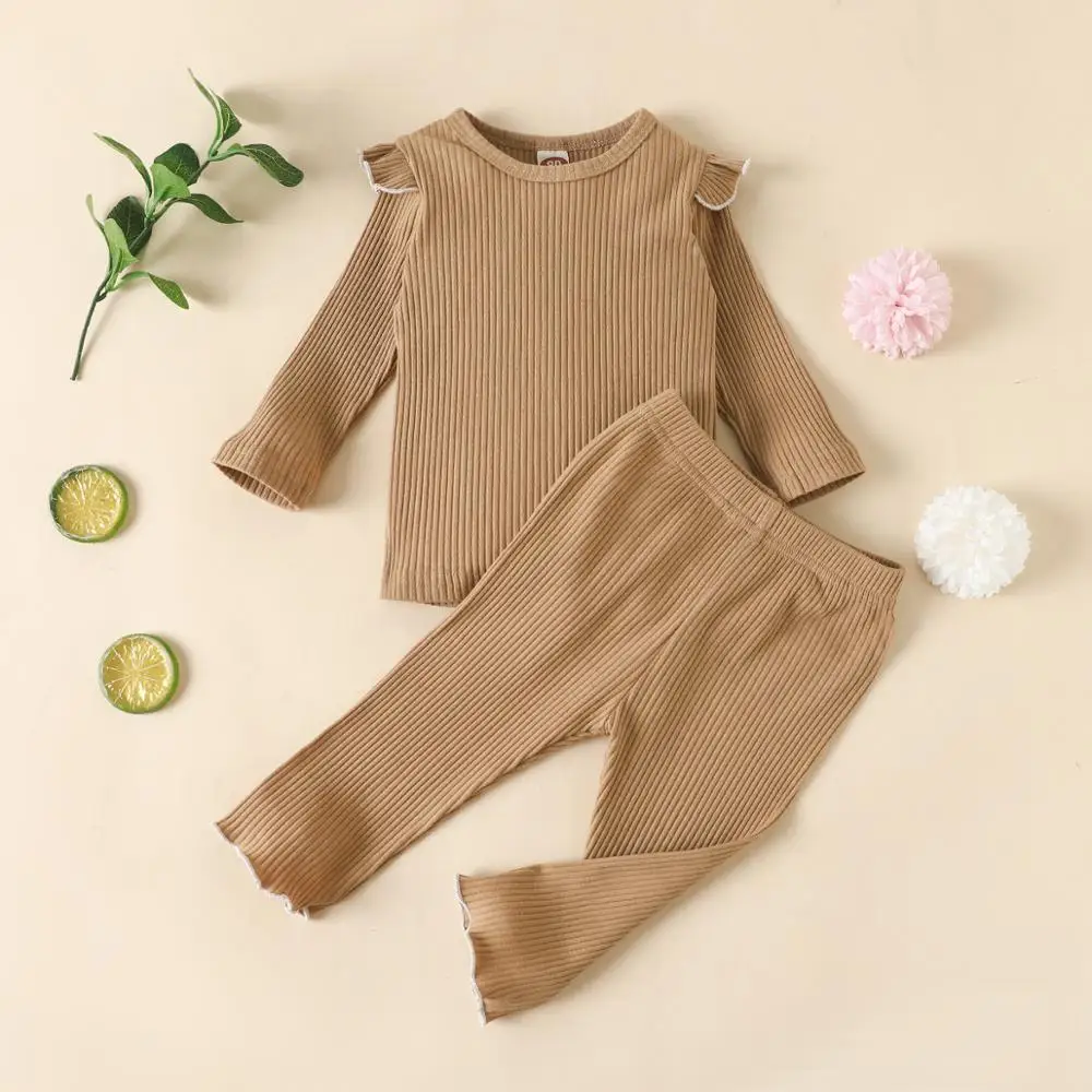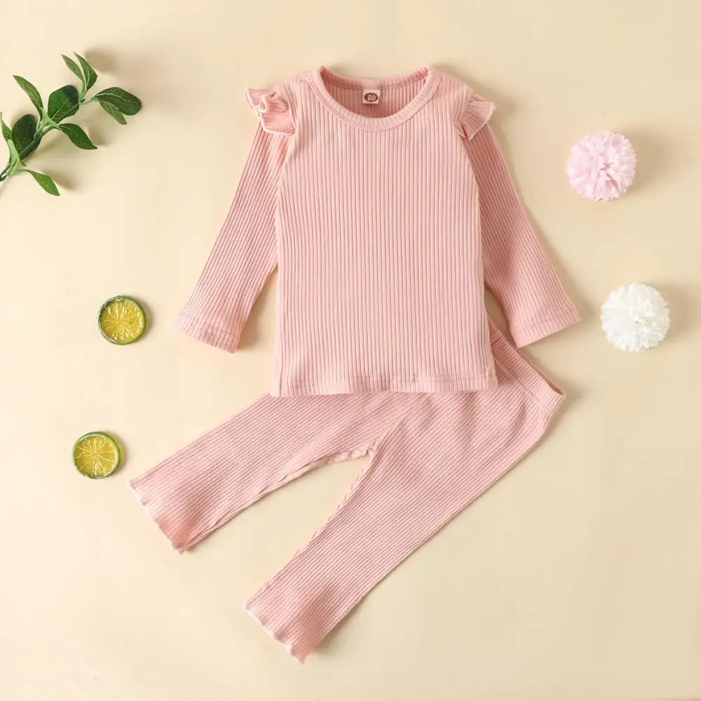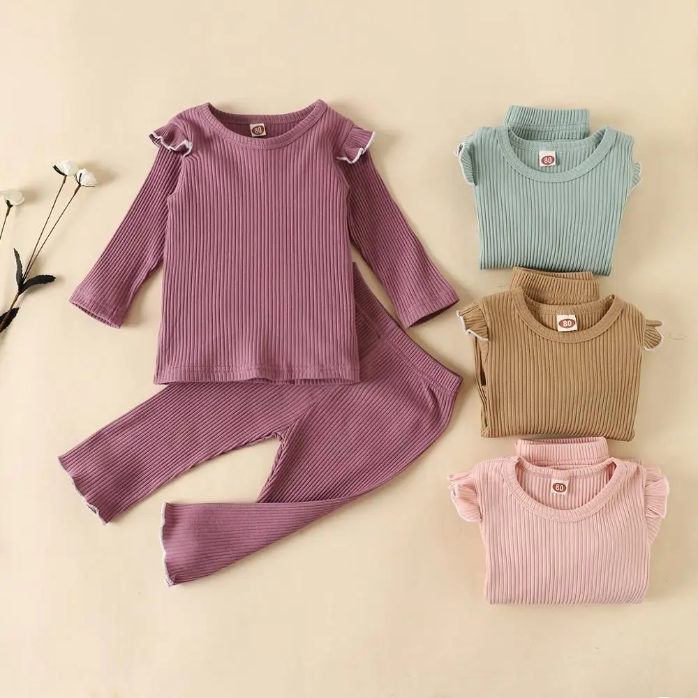 Детская приталенная пижама в рубчик, детский хлопковый комплект из топа и брюк, одежда для сна унисекс для девочек и мальчиков, осенняя одежда для сна с рукавами-лепестками