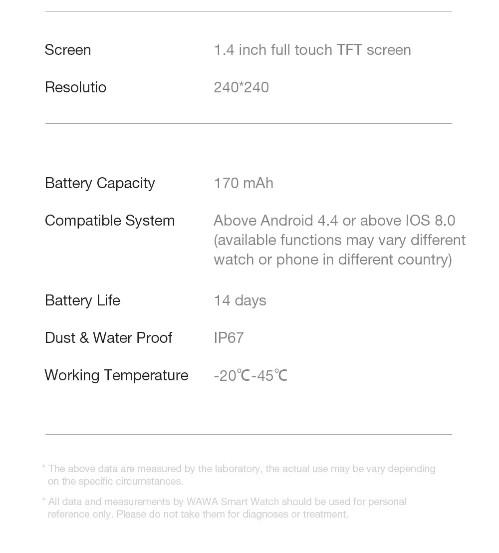 Название продукта: умные часы SANLEPUSРазмер: 43*36,6*9,3 мм (1,69*1,44*0,37 дюйма)Длина ремешка: 258 мм (10,16 дюйма)Вес: 46 гЭкран: 1,4 дюймов полный сенсорный экран на тонкопленочных транзисторах на тонкоплёночных транзисторах ЭкранРазрешение: 240*240Емкость аккумулятора: 170 мАчСовместимая система: выше Android 4,4 или выше IOS 8,0 (Доступные функции могут отличаться от функций часов или телефона в разных странах)Срок службы батареи: 14 днейЗащита от пыли и воды: IP67Рабочая температура:-20 ℃-45 ℃* Приведенные выше данные измеряются лабораторией, фактическое использование может варьироваться в зависимости от конкретных обстоятельств.* Все данные и измерения смарт-часов SANLEPUS должны использоваться только для личной справки. Пожалуйста, не принимайте их для диагностики или лечения.