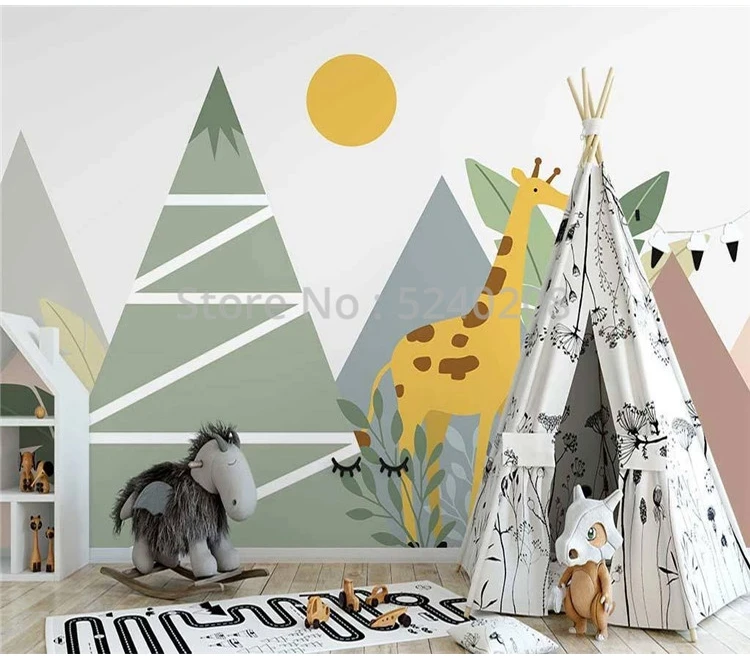 Настенные 3D-обои на заказ, нарисованные геометрическим рисунком горы, пика, мультяшный жираф, Фреска для детской комнаты, самоклеящиеся наклейки на стену