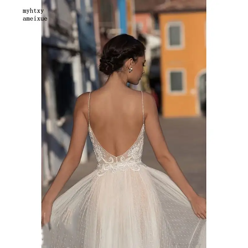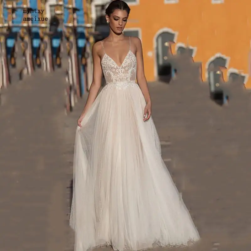 Недорогое пляжное свадебное платье 2020, богемное кружевное свадебное платье в стиле бохо, свадебные платья на бретелях-спагетти с открытой спиной и V-образным вырезом