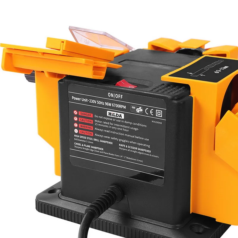 Параметры Напряжение: 230-240 В/110-220 В Тип диска (колеса): шлифовальные диски Мощность: 96 Вт/65 Вт Скорость холостого хода: 6700 об/мин/6000 об/мин (без нагрузки) Размеры: 220*200*150 мм/220*200*180 мм Тип штекера: США/ЕС Использование: дом «сделай сам» Размер диска: 51*10*7,5 мм Материал: пластик, железо Цвет: синий/красный/желтый Диапазон ширины ножа: 6 ~ 51 мм, ширина неограниченная Размер сверла: диаметр: подвесной: 3 ~ 13 мм/подвесной: 3 ~ 10 мм Регулируемый диапазон углов: 15 ~ 50 ° (есть сильные магниты) Посылка ция: 1 * точильный станок для ножей, 1/3 * шлифовальный круг, 1 * Руководство пользователя