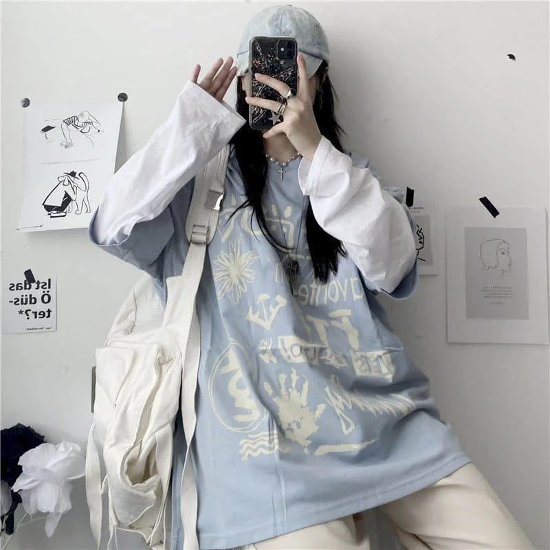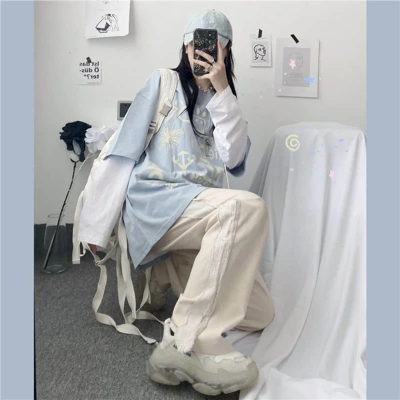 Японский стиль Харадзюку женская футболка с цветочным принтом, с дл...