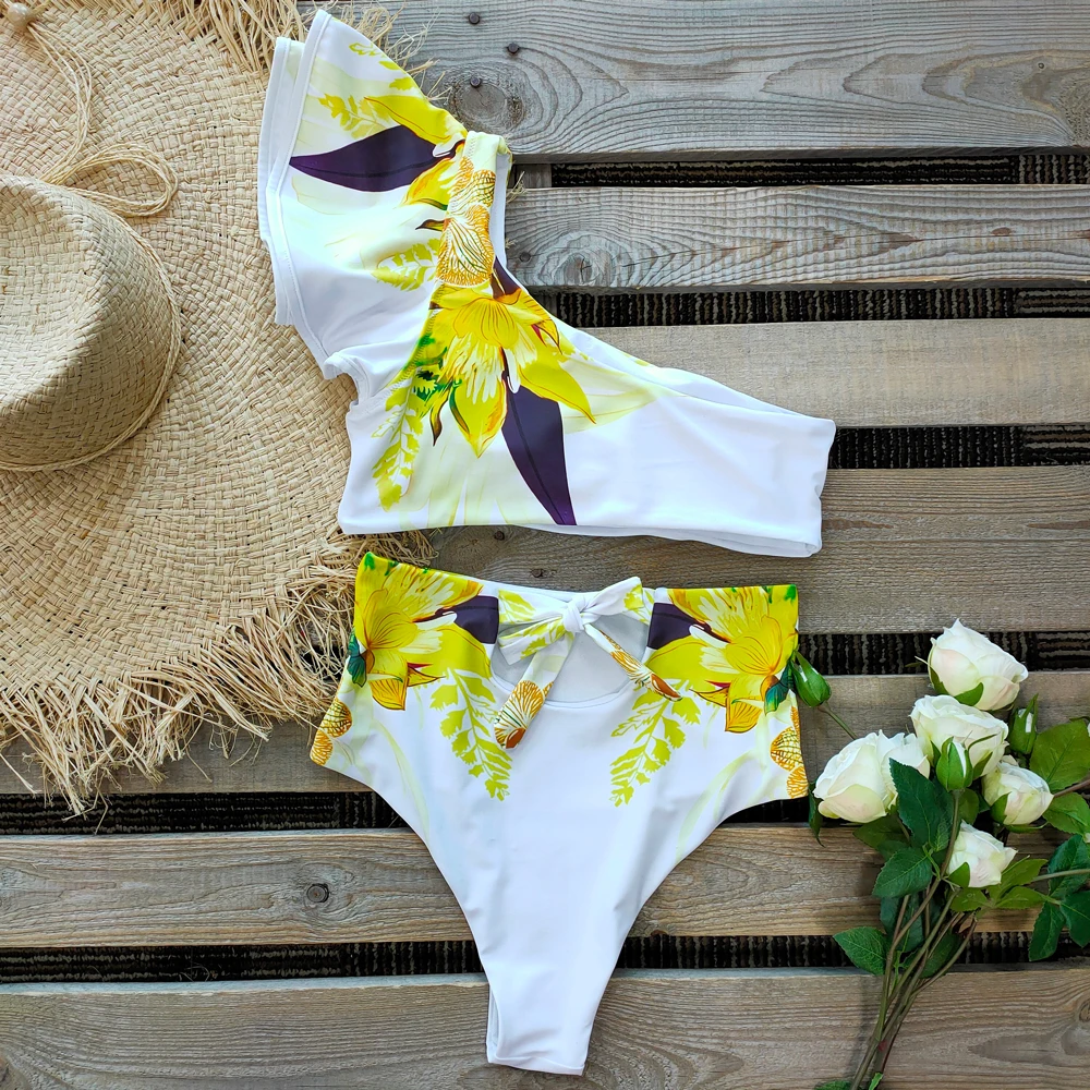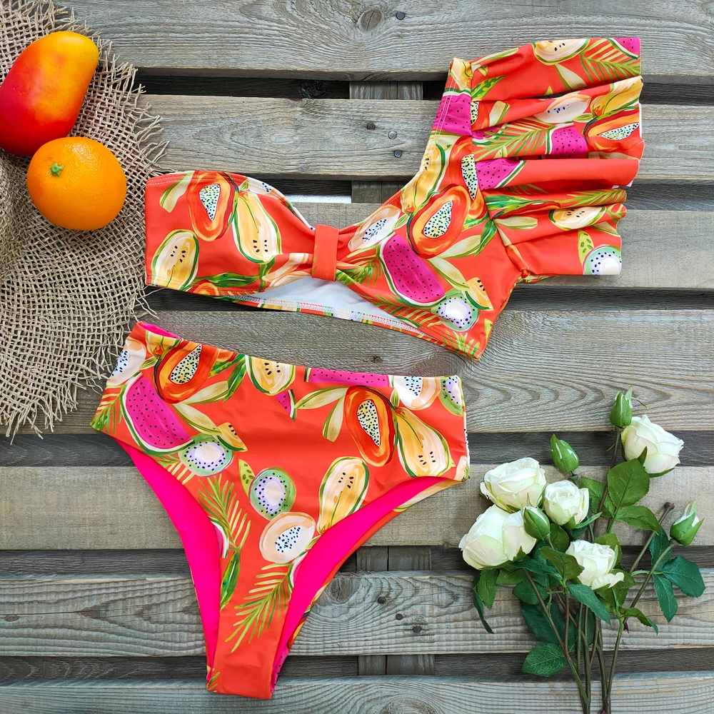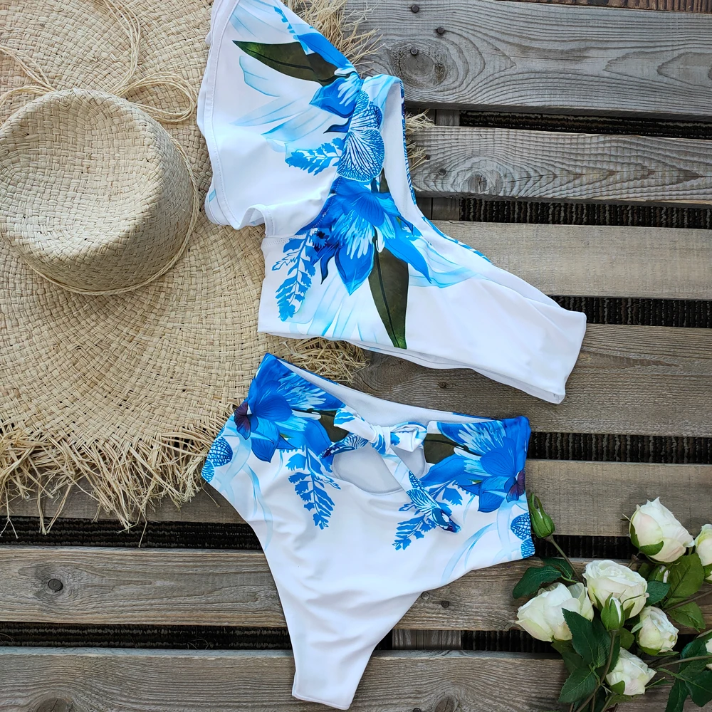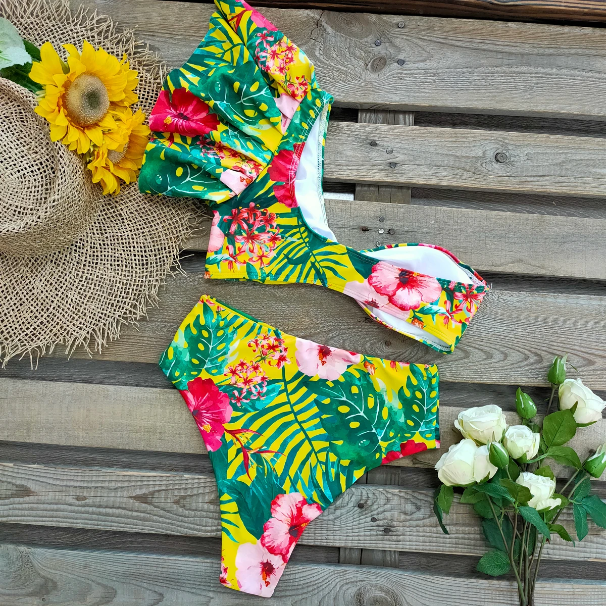 Купальник на одно плечо, бикини с принтом, комплект бразильского бикини, купальники с высокой талией, купальный костюм, летняя пляжная одежда