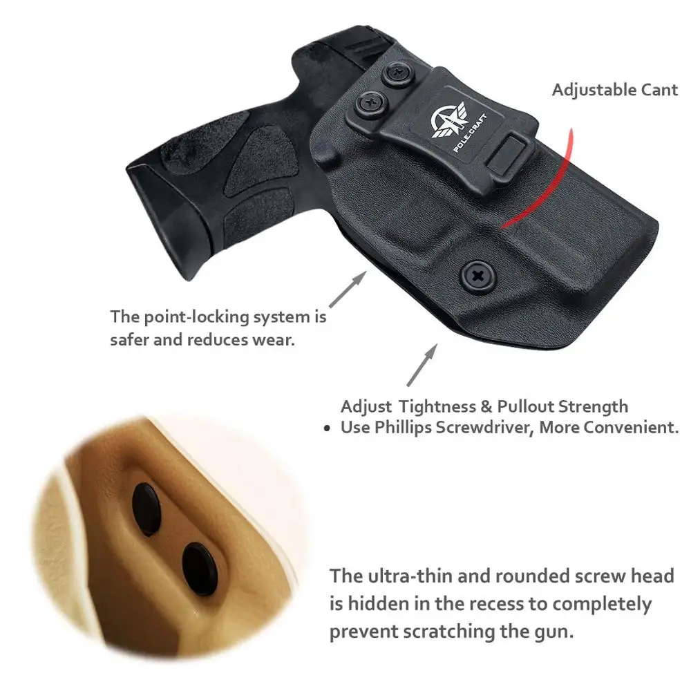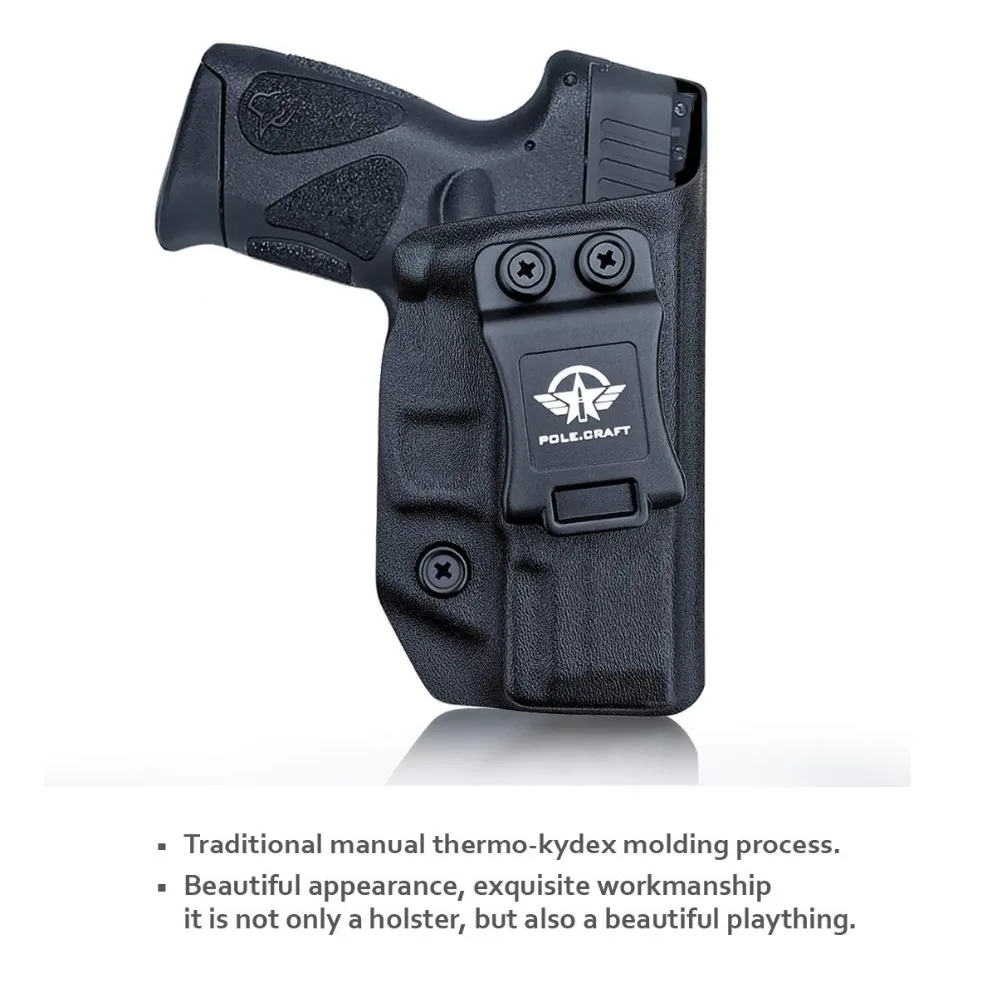 Носить с собой с уверенностью: пожалуйста, не стесняйтесь использовать Полюс. Ремесло Портативный Скрытая кобура, чтобы защитить ваш Телец G3C кобура. Это наше третье поколение пистолета Kydex кобура IWB, предназначенное для пистолета taulus G3C, также совместимо с пистолетом taulus G2C / G2S / Millennium PT111 G2 / PT140. Он не только высокоточный, но также прочный и прочный, может быть скрыт и портативный, так что вы можете защитить себя в любое время и в любом месте.