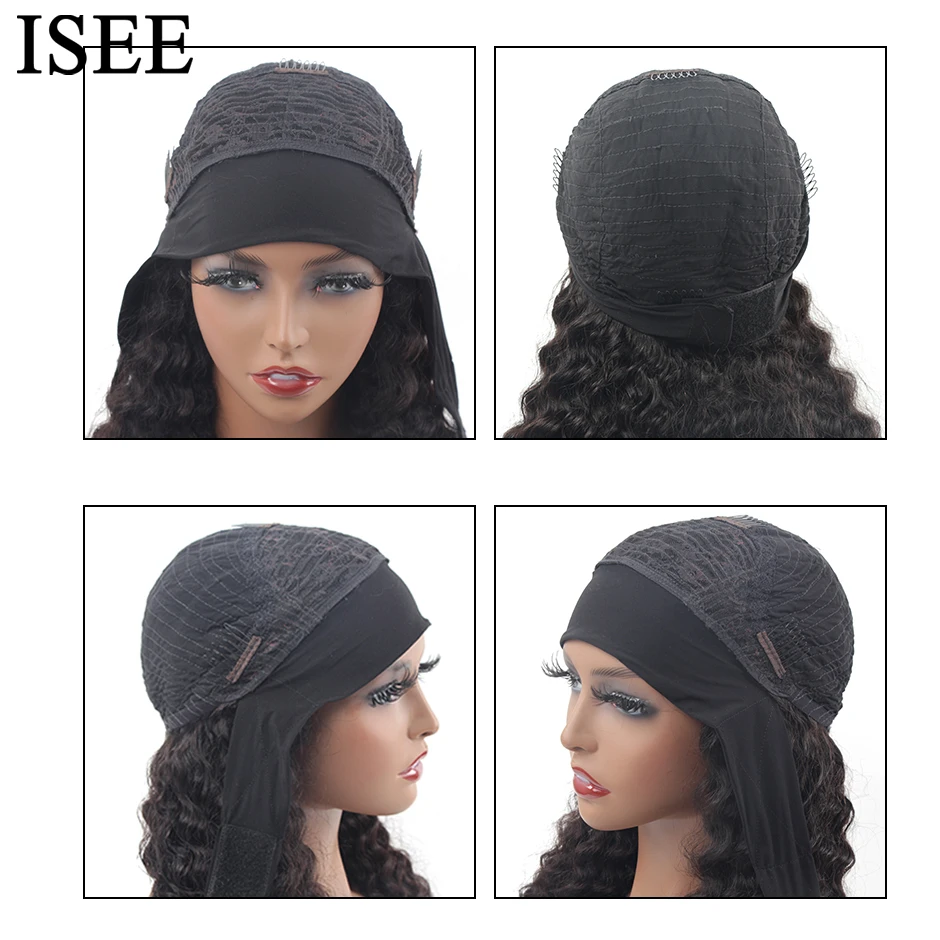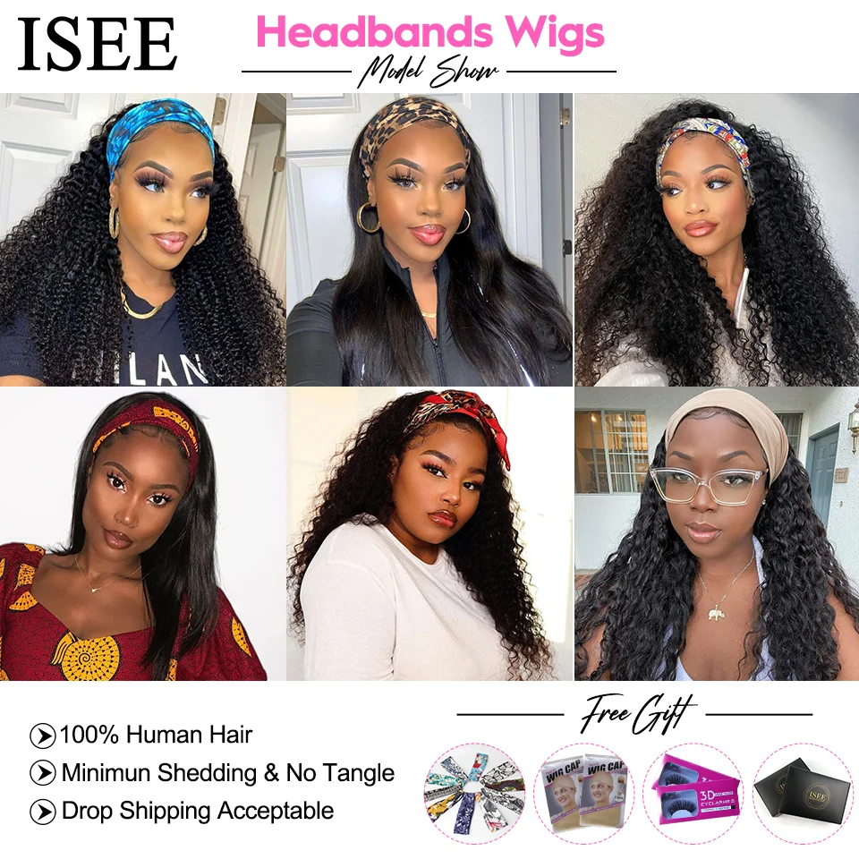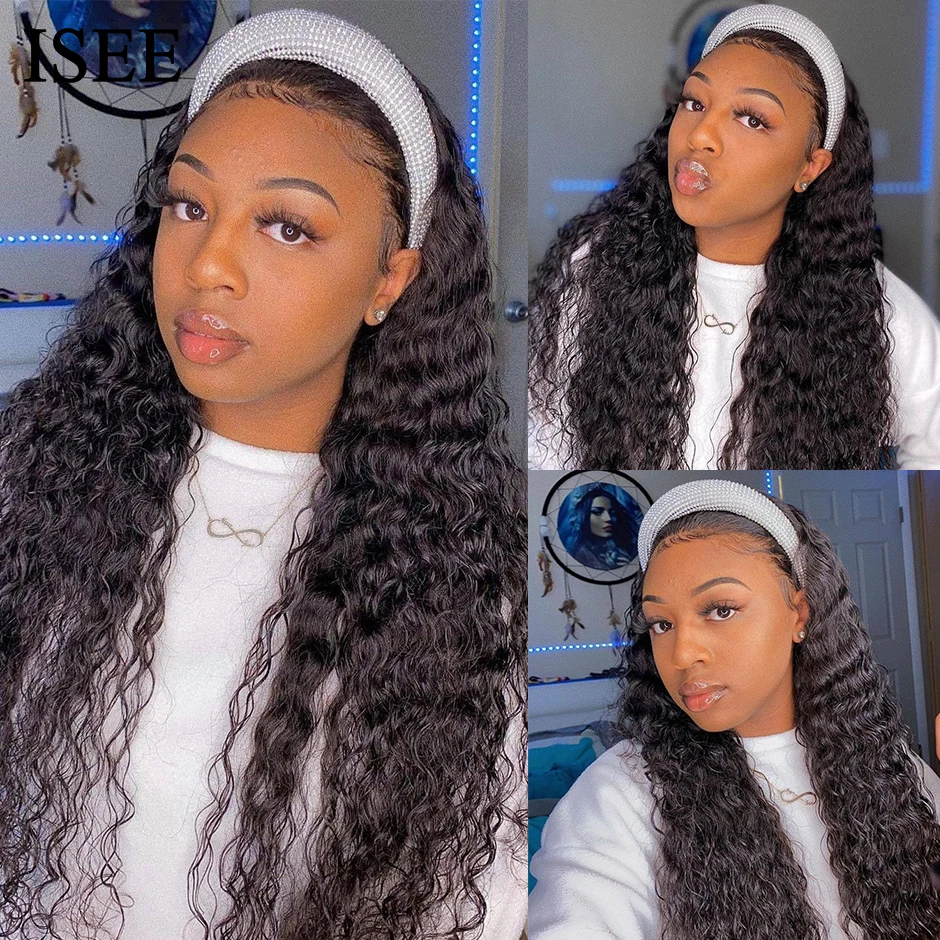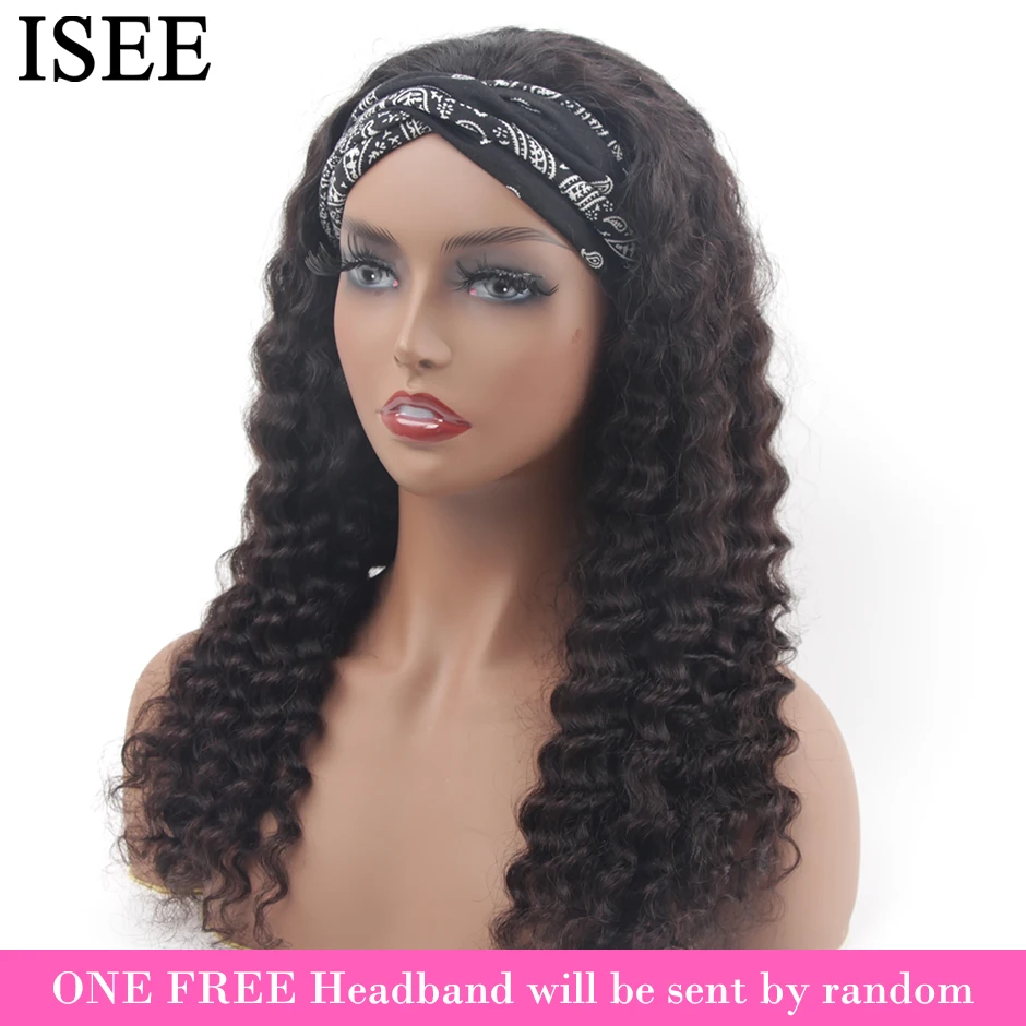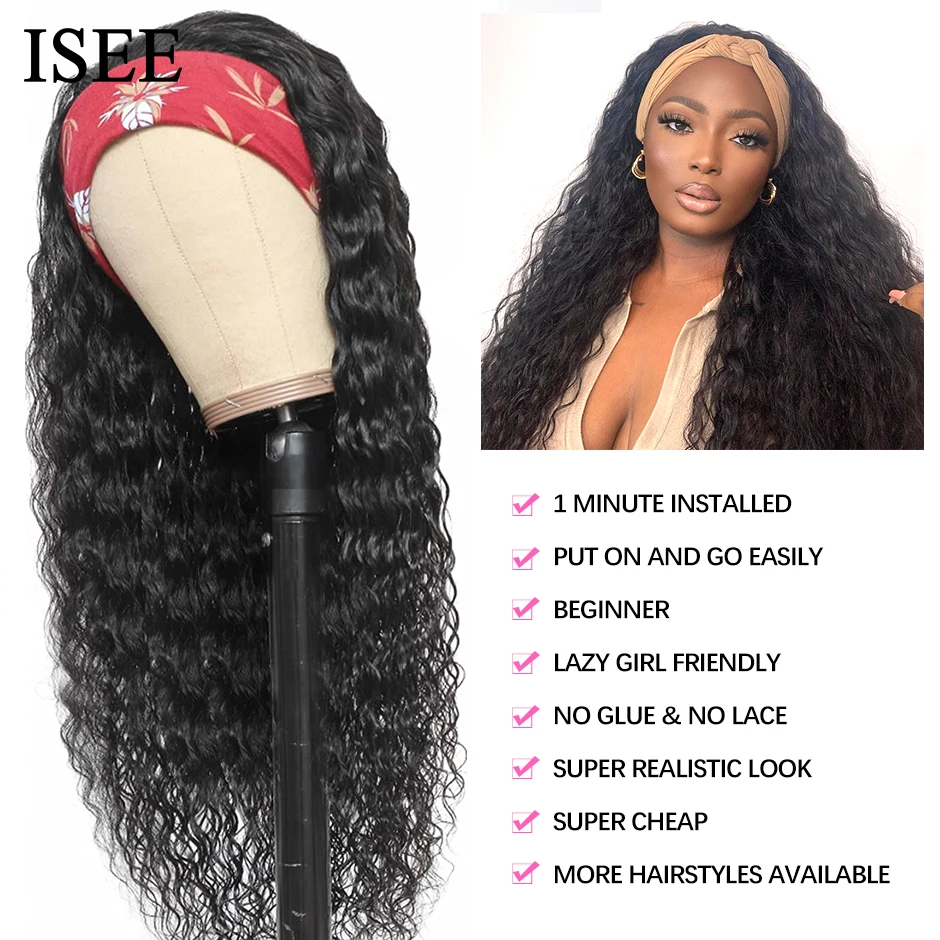 Brazilian Deep Wave Headband Wig Natural Hair 180% Density ISEE HAIR Deep Curly Headband Wig For Women Human Hair Wigs Scarf Wig