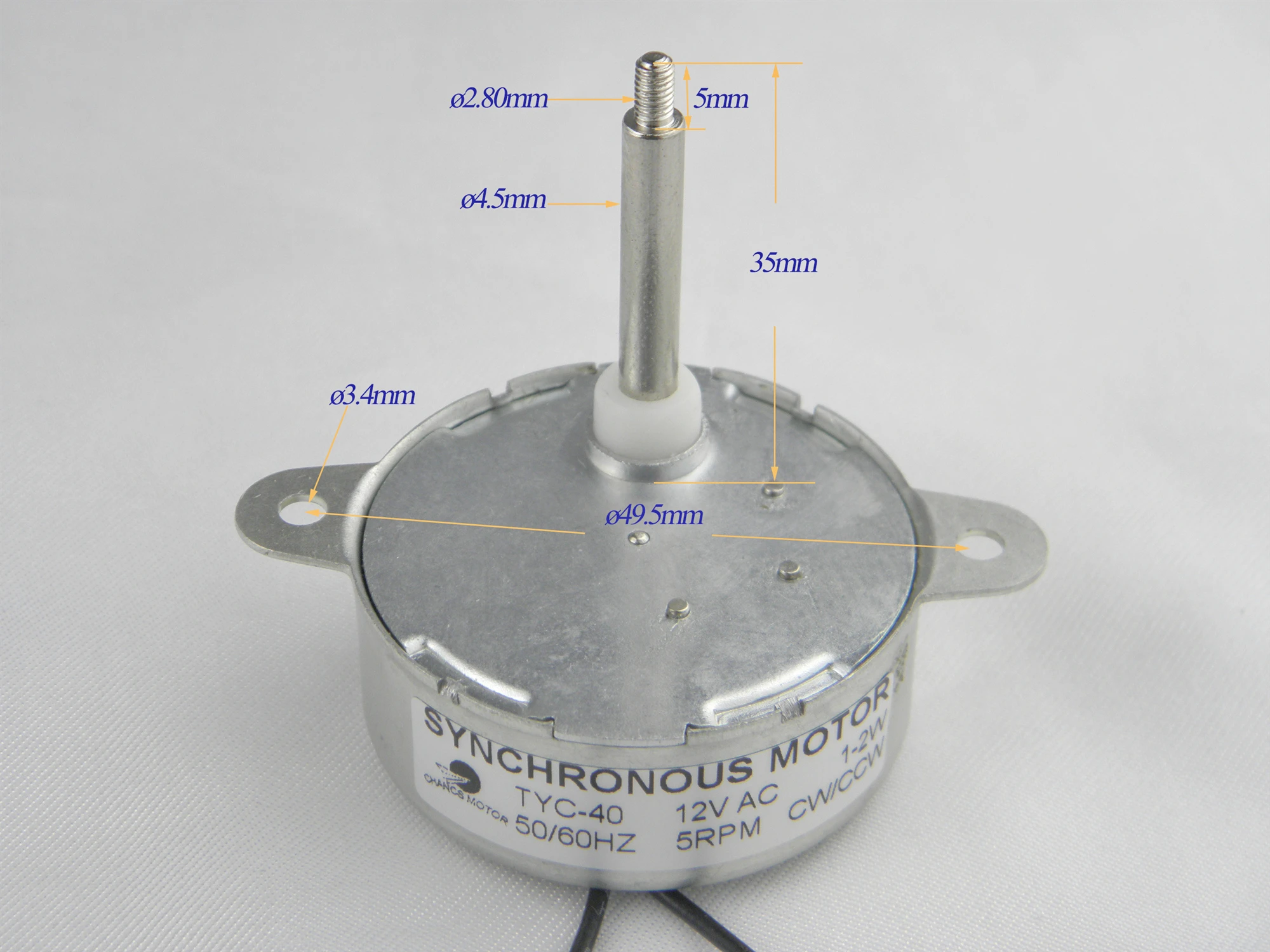 Название продукта: Синхронный двигатель;Напряжение: 12 В переменного тока;Модель: TYC-40;Скорость: 5 об/мин;Вал Диаметр: 4,5 мм;Длина вала: 35 мм;Внутренний диаметр винтовой резьбы вала: М3, (Φ2.8мм);Диаметр монтажного отверстия: M4 (φ3.4мм);Направление: CW/CCW(UNCONTROLLAB);Крутящий момент: ≤ 0,5кг * см;Частота: 50/ 60 Гц;