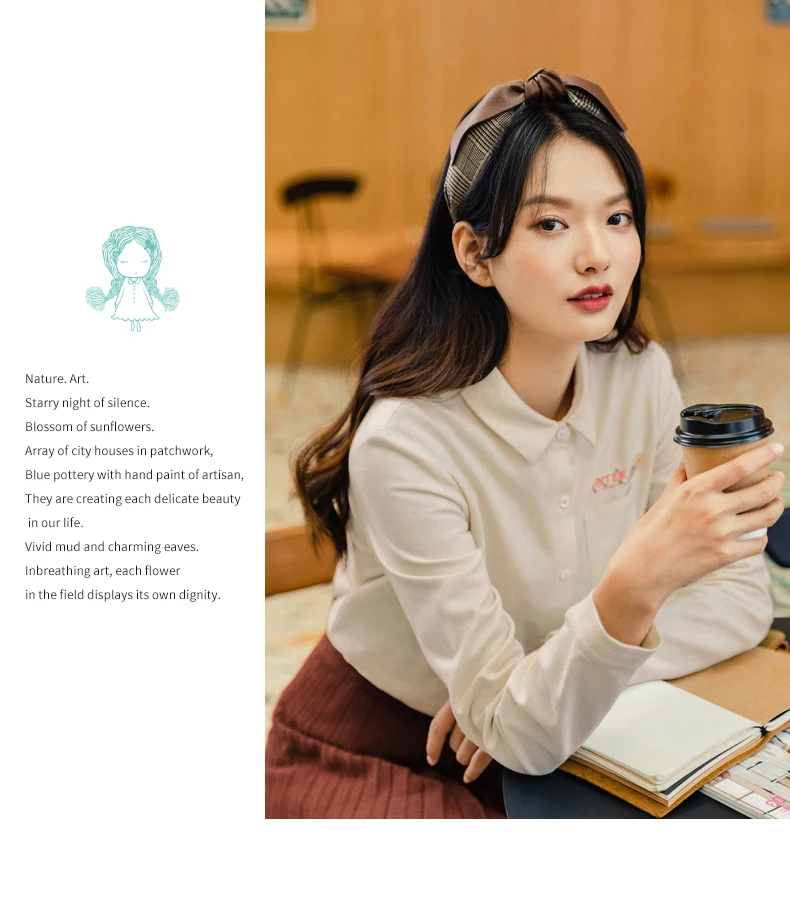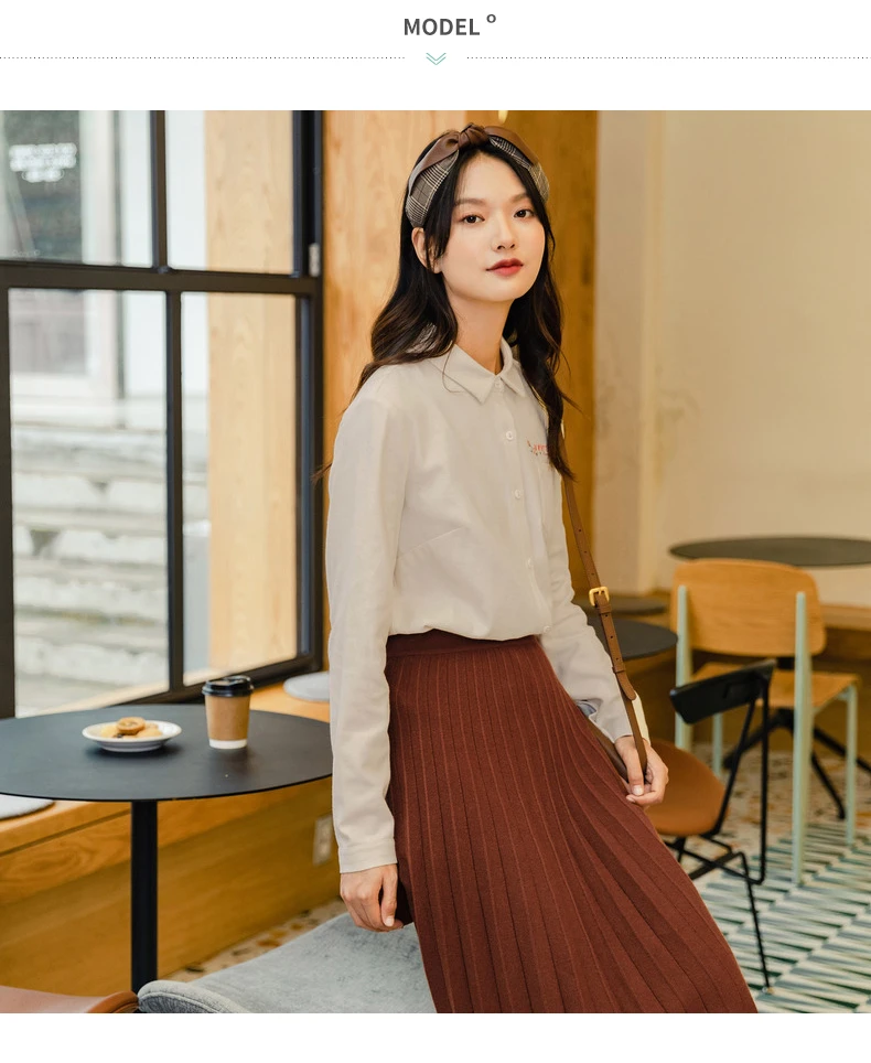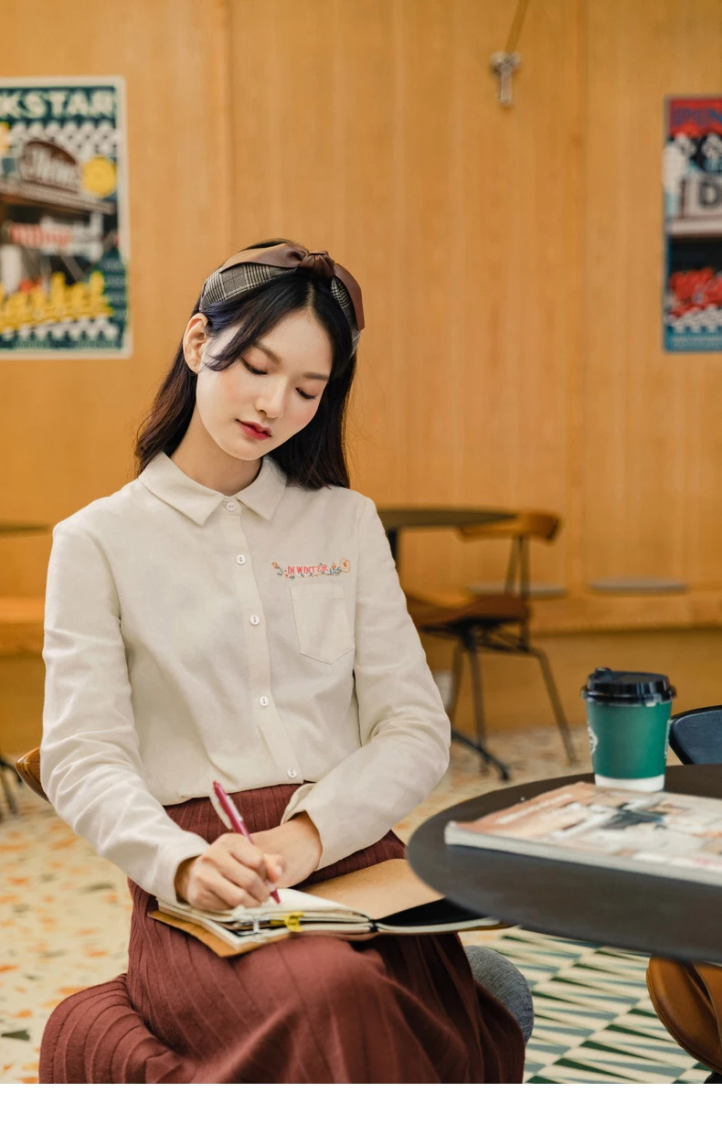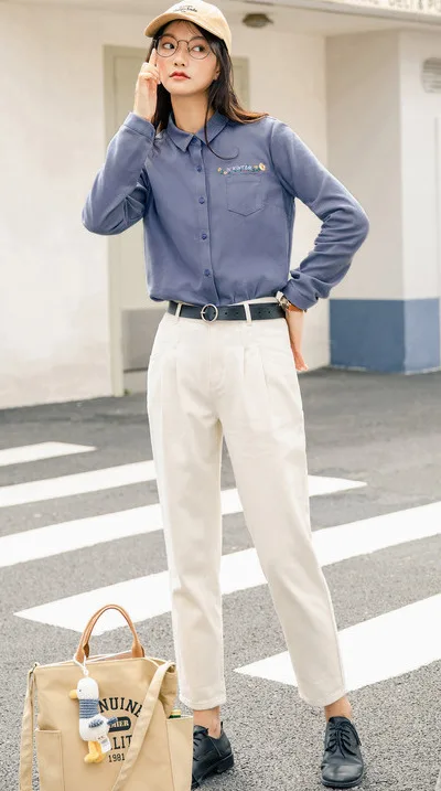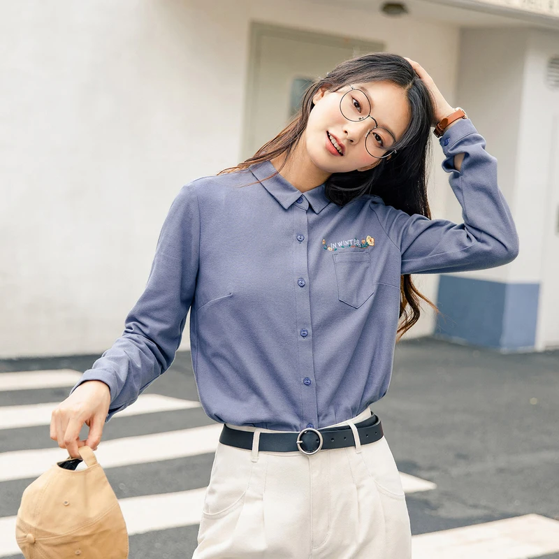 Осенне-зимняя Базовая Блузка с длинным рукавом в Корейском стиле, голубая блузка с вышивкой, топ из чистого хлопка, женская рубашка с воротником