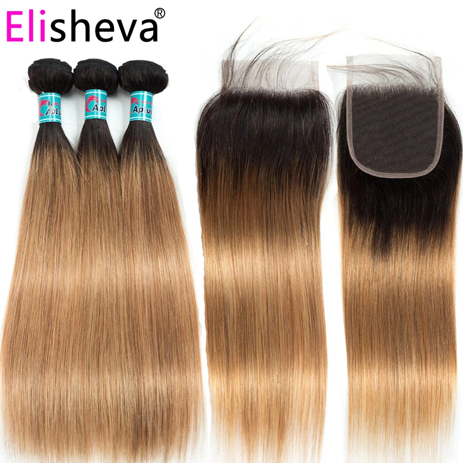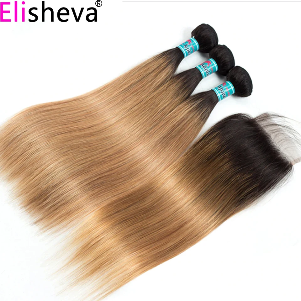 Цветные прямые 1b27 пучки омбре с застежкой малазийские Человеческие волосы Remy коричневые медовые светлые 3 пряди с застежкой 4x4