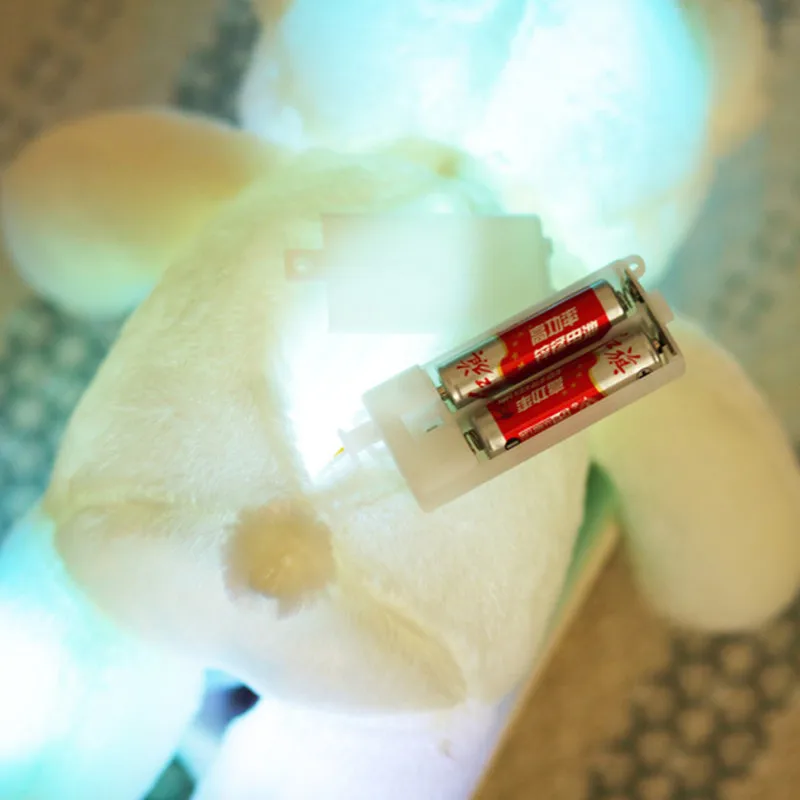 Внутри живота плюшевого мишки был вставлен светодиодный прибор, есть более 7 меняющихся цветов, может сиять после того, как оснащен 3 батареями АА.
