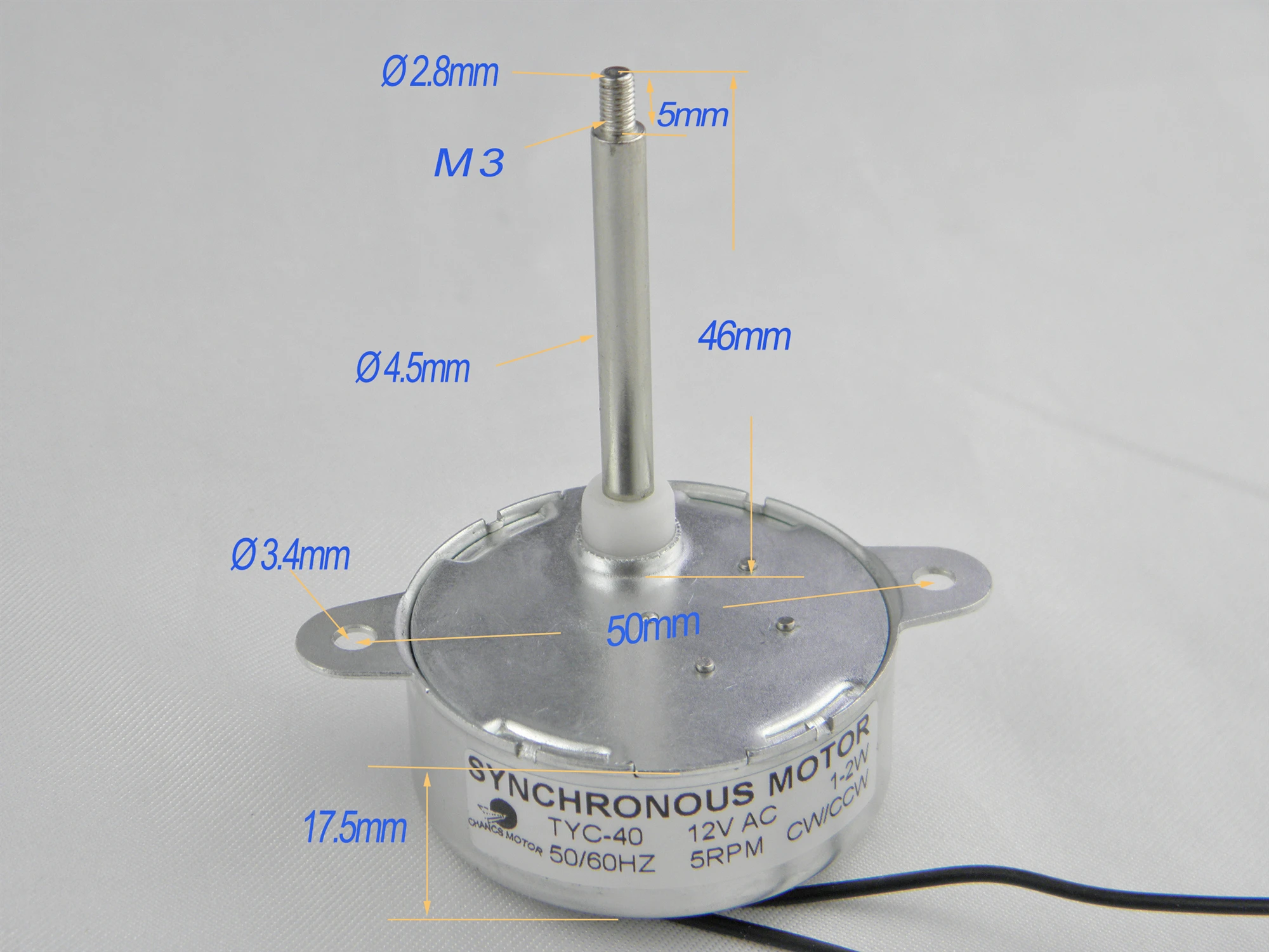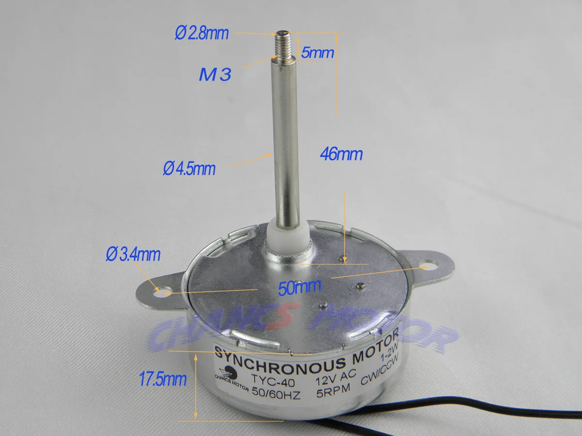 Название продукта: Синхронный двигатель;Напряжение: 12 В постоянного тока;Модель: TYC-40;Скорость: 5 об/мин;Вал Диаметр: 4,5 мм;Длина вала: 46 мм;Внутренний диаметр винтовой резьбы вала: М3, (Φ2.8мм);Диаметр монтажного отверстия: M4 (φ3.4мм);Направление: CW/CCW(UNCONTROLLAB);Крутящий момент: ≤ 0,5кг * см;Частота: 50/ 60 Гц;
