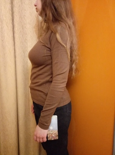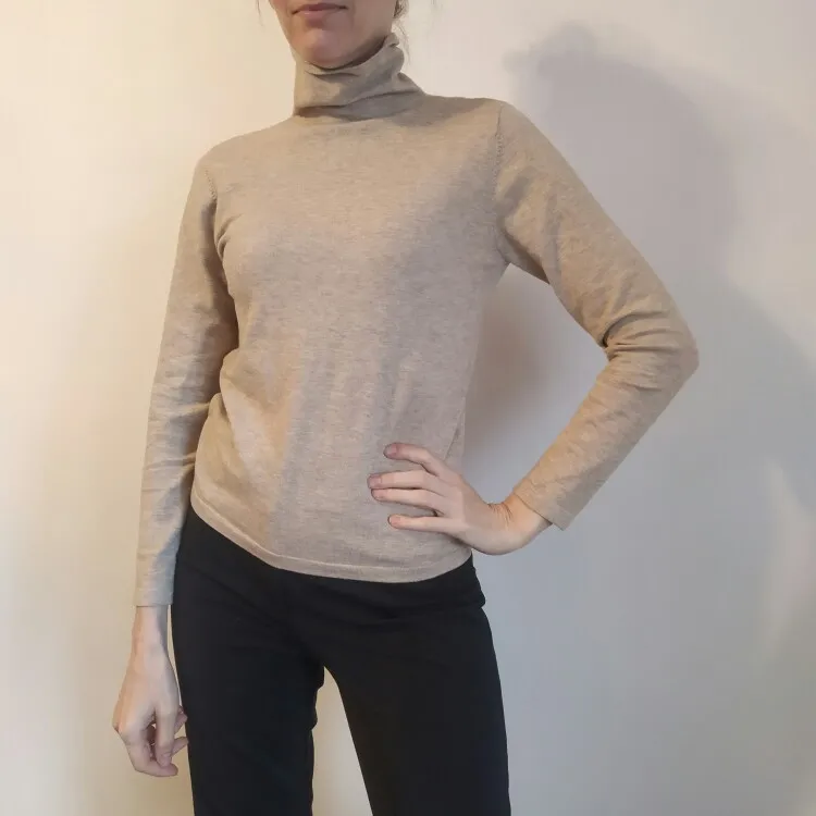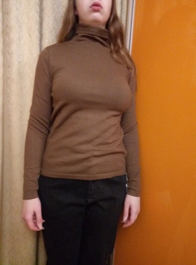 Водолазка прекрасного качества, как и все вещи в этом магазине. Плотная, не колючая, на грудь 75 см норм, не обтягивает.