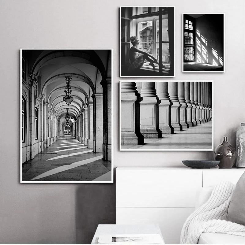 Nordic черно-белое здание холст для живописи девушка Wall Art s печать настенные картины для Гостиная в скандинавском стиле