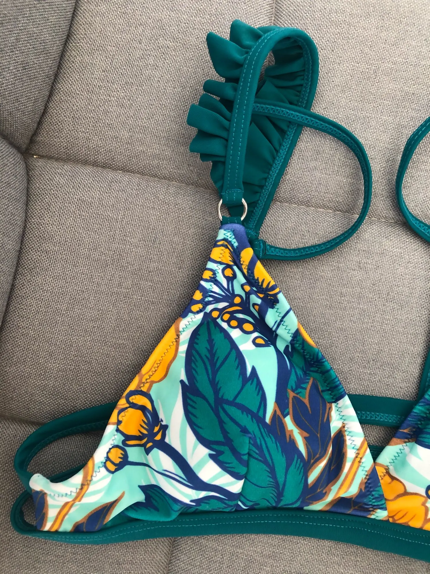 Для девушки, которая любит солнечный свет и хороший цветочный принт! Наш Милый Цветочный Топ бикини с оборками изготовлен с любовью. Верх бикини с треугольными чашечками и регулируемыми бретелями с оборками на завязках сзади.