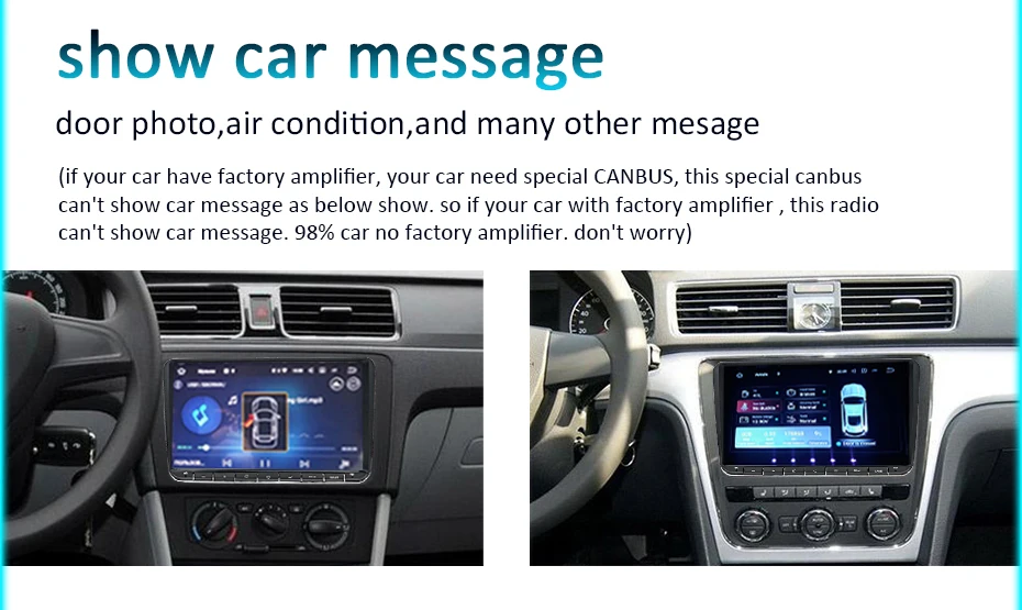 Показать сообщение автомобиляФото двери, кондиционер и многие другие мезажи(Если ваш автомобиль имеет заводскую амплитуду, вашему автомобилю нужен специальный CANBUS, этот специальный canbus не может показать автомобильное сообщение, как показано ниже.Так что если ваш автомобиль с заводским усилителем, это радио не может показать автомобильное сообщение. 98% автомобильный не заводской усилитель. Не волнуйтесь)