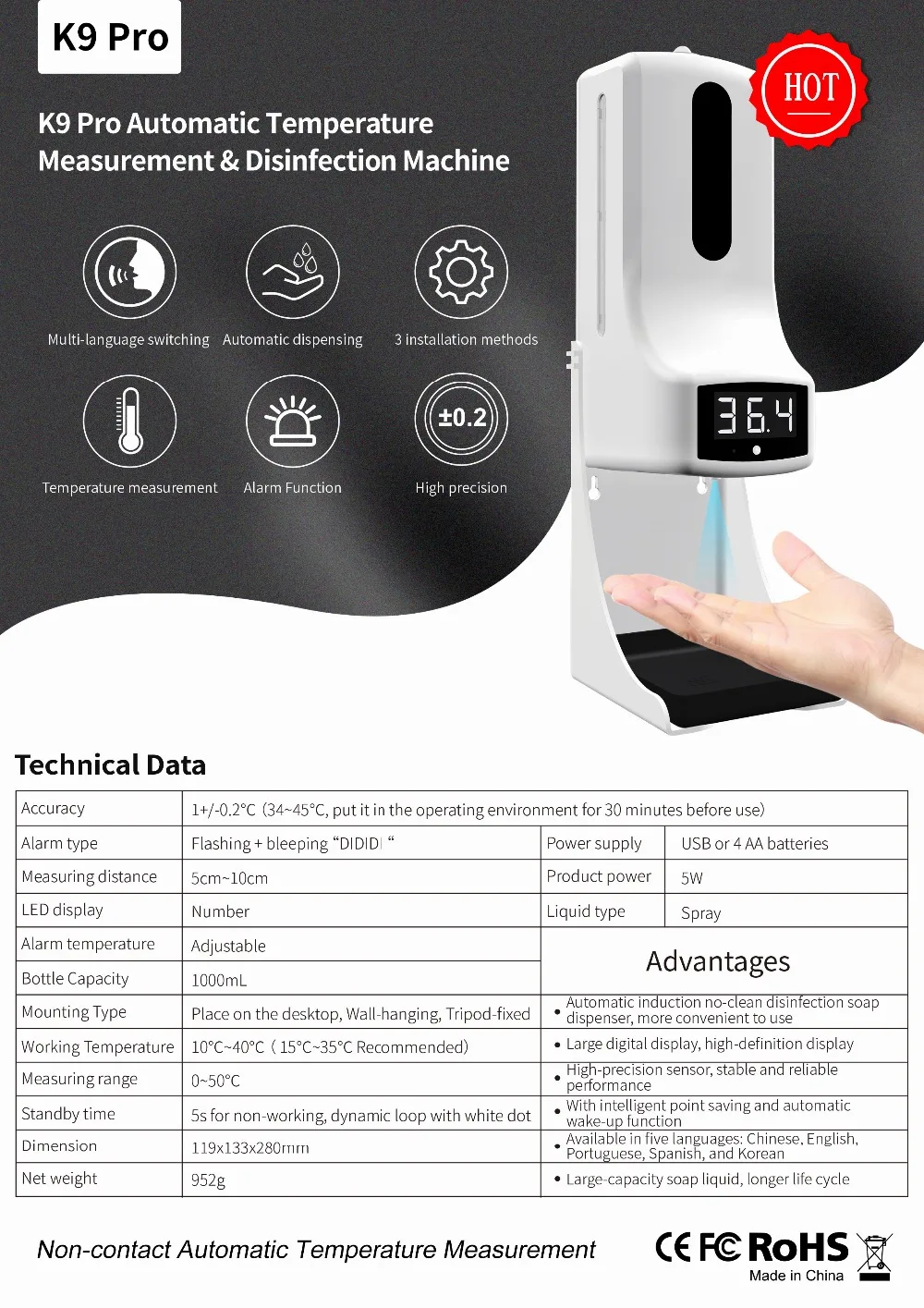 Инфракрасный термометр 2 в 1 K9, автоматический дозатор мыла, интегрированная машина для измерения и дезинфекции температуры ладони