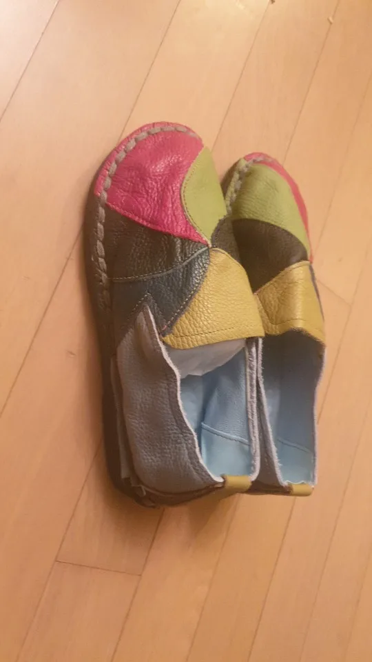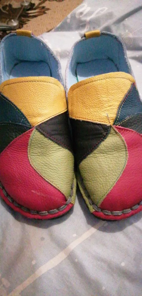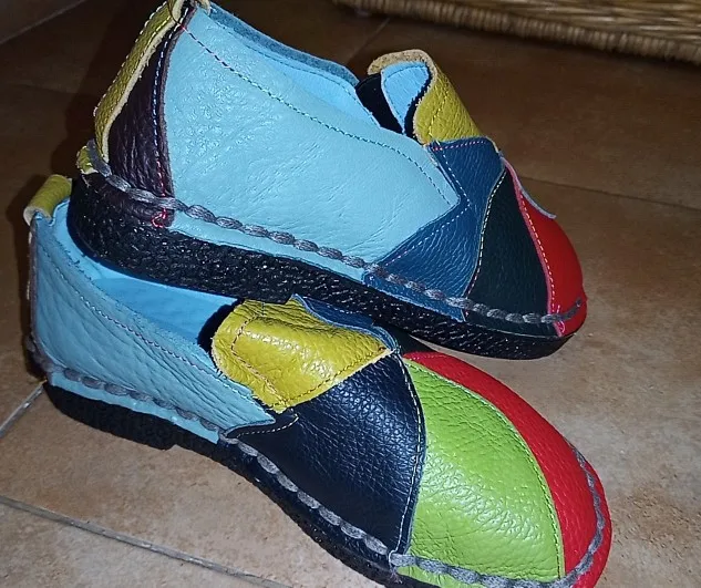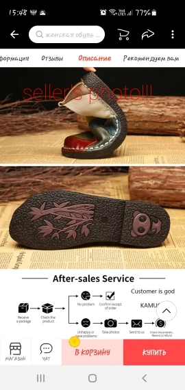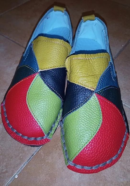 Я так ждала эти туфли, так их хотела. Заказ пришел быстро, нигде не застрял, все впорядке с пересылкой и почтой. И размер - подошёл, и - удобно, мягкие круглые носы, всё как мне нужно. Но подвох всё-равно нарисовался....Непрошитые строчки кожи верха и подкладки, неровно нарезанные детали подкладки, где внахлёст, а где не хватило ткани. Рантовые швы неровные, стяжок разной длины, разного натяжения. Сшито из кожи разных цветов, вроде бы, должно быть как на картинке у продавца! Вела спор, половину суммы вернули сразу. Жаль мне в этом случае продавца, наверно в Поднебесной он не может отказаться продавать не совсем качественный товар, а артели клепают - как попало.