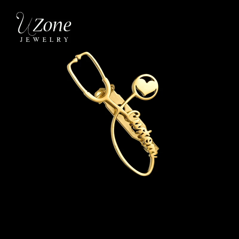 Uzone пользовательские медицинские стетоскоп Броши из нержавеющей стали персонализированные сердце Имя брошь булавки для женщин мужчин уход ювелирные изделия подарок