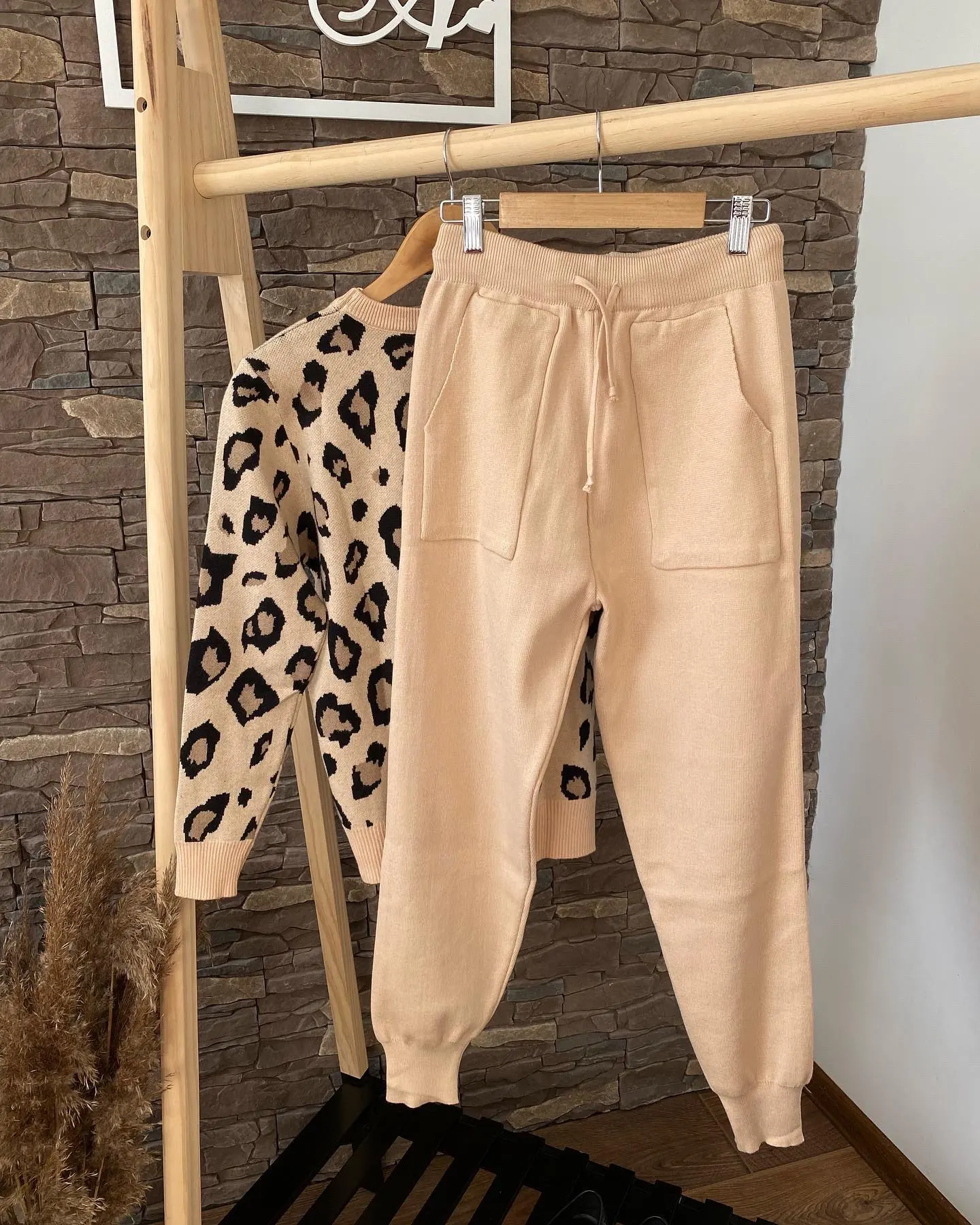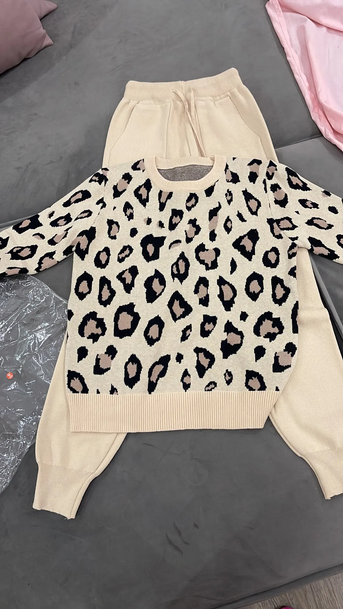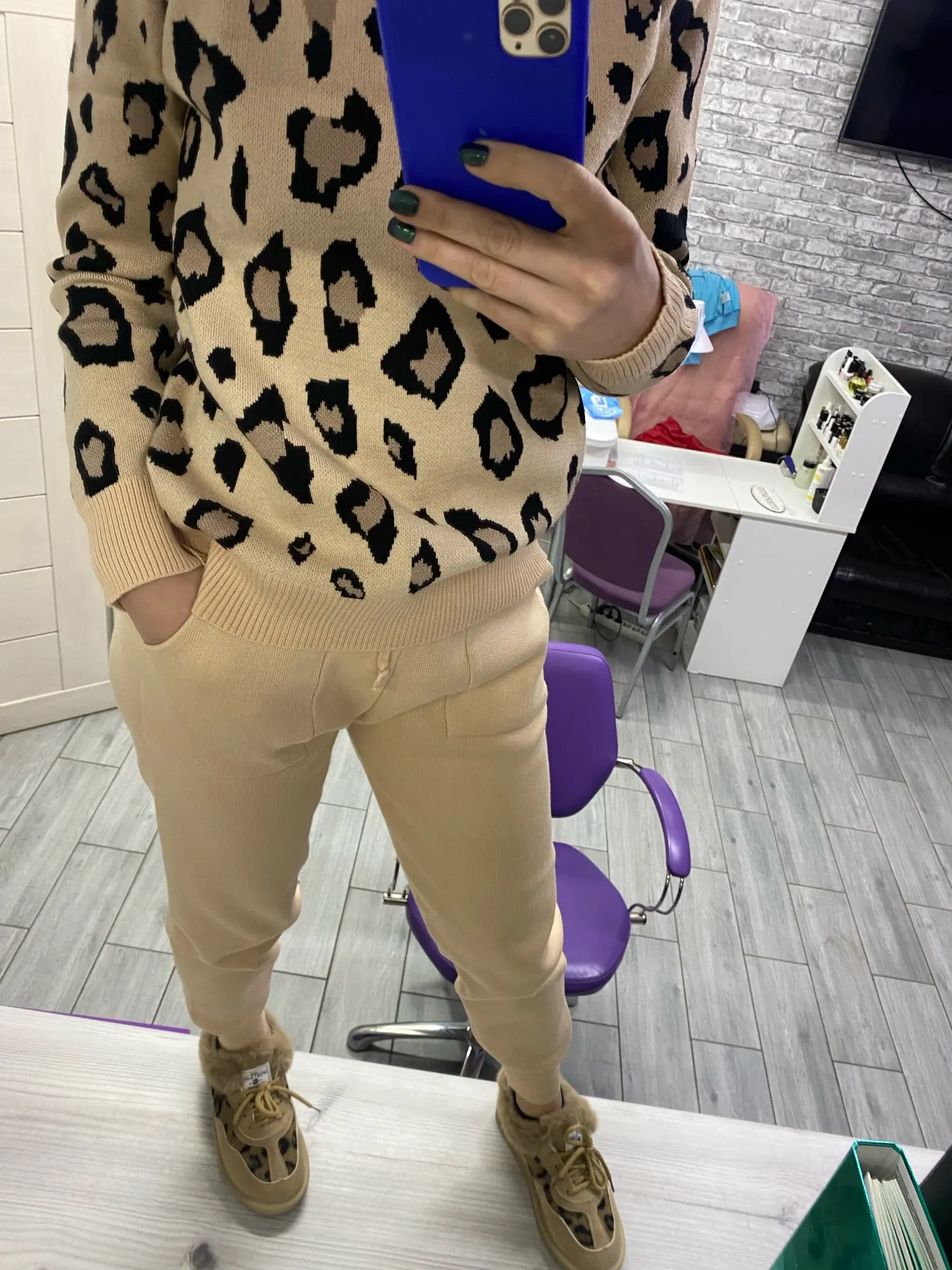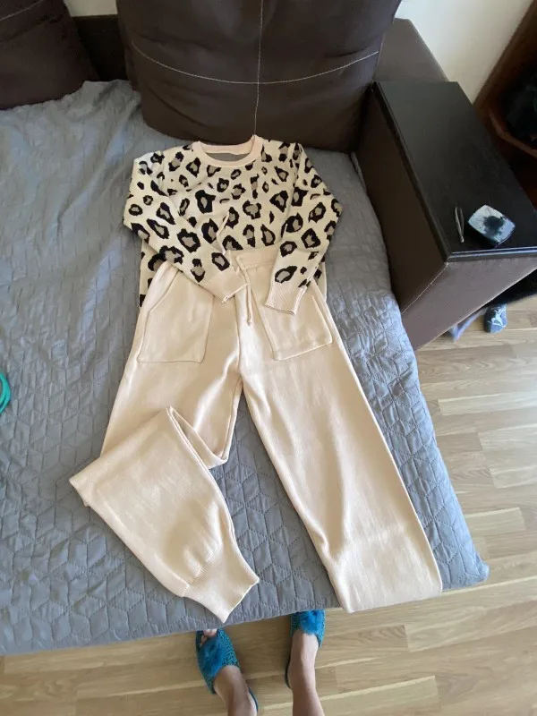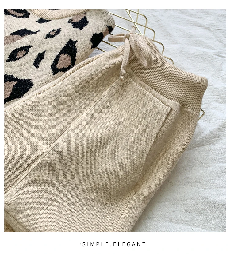 Женский трикотажный пуловер SMTHMA с длинным рукавом и леопардовым принтом, свитер + штаны с эластичной резинкой на талии, модные брюки, костюм из двух предметов