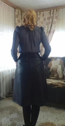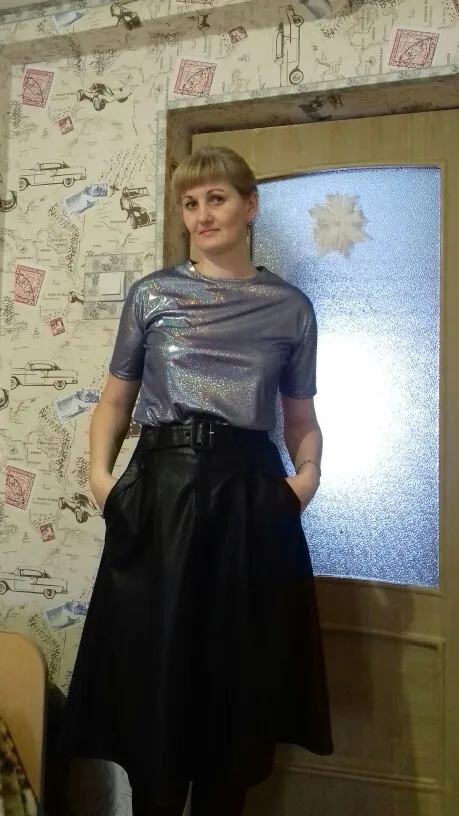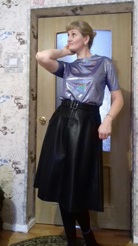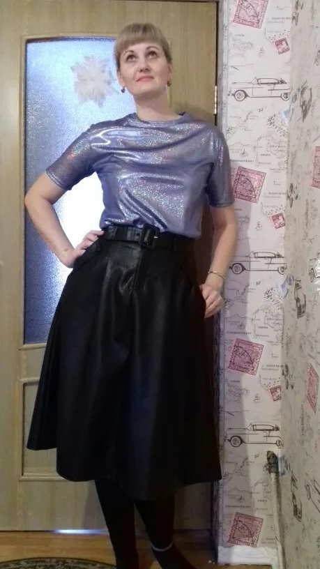 Очень красивая и модная юбка! Кожа качественная, пошив на 5 и цвет благородный! Мой размер 50, мне на поясе не хватает дырочки, все остальное в юбке просто супер! Достойна и 10 звезд!!!