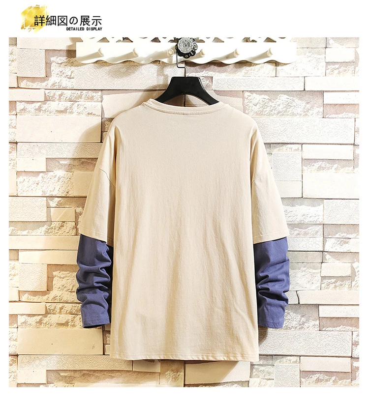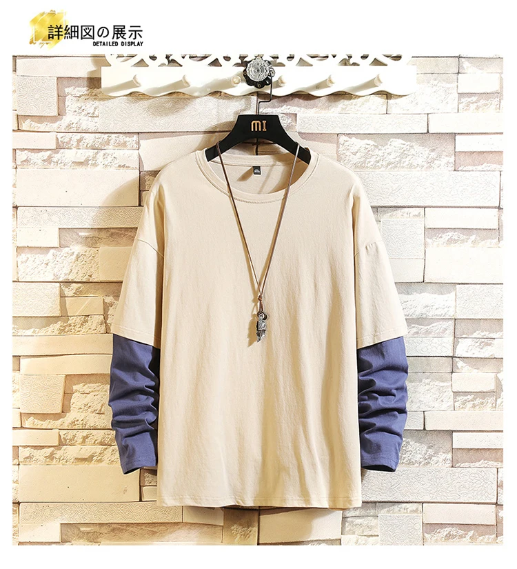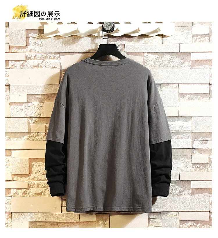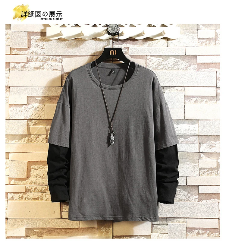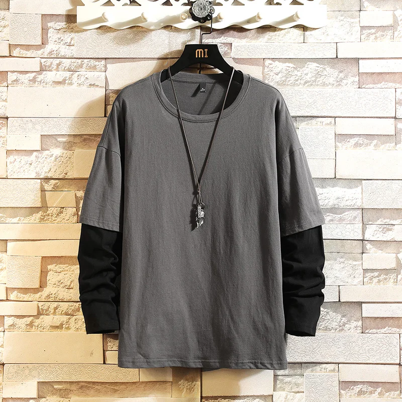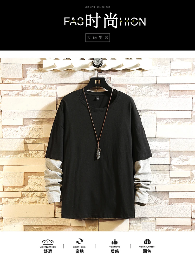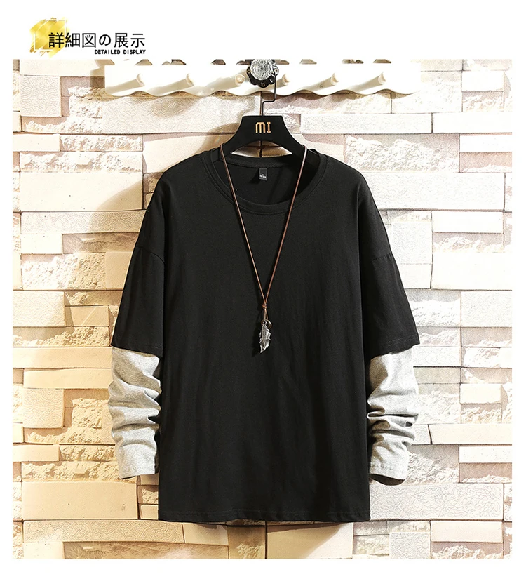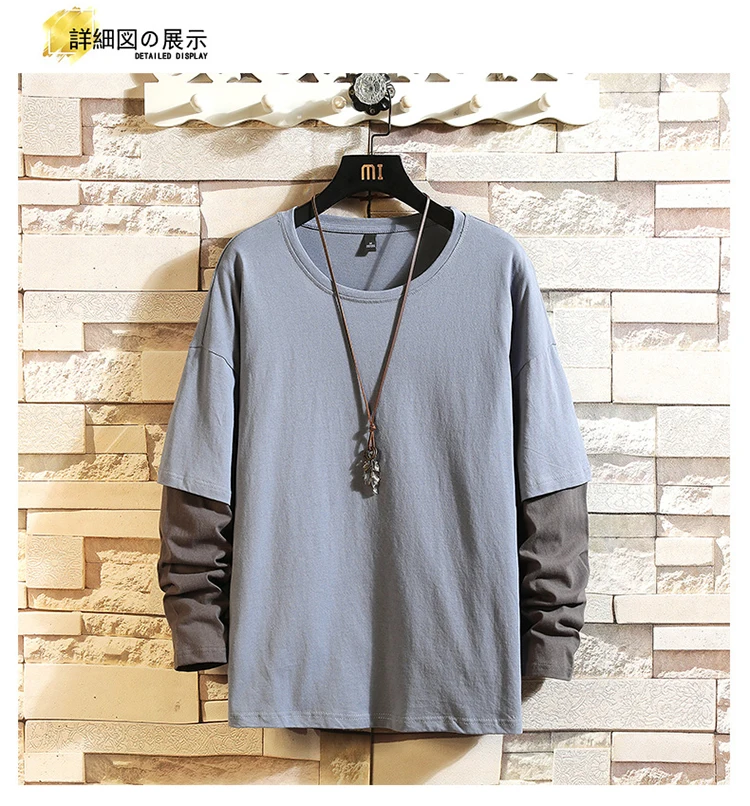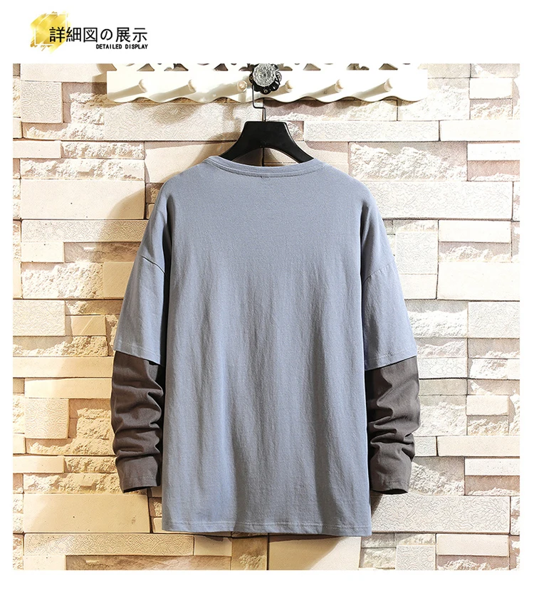 Футболка мужская в стиле оверсайз, модная тенниска из двух предметов, с длинным рукавом, с круглым вырезом, повседневная майка, осень 2020
