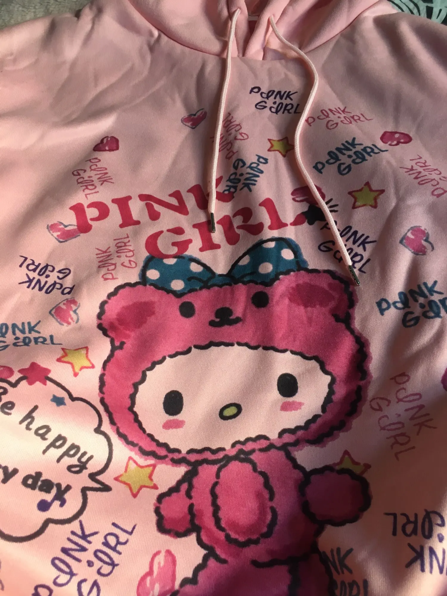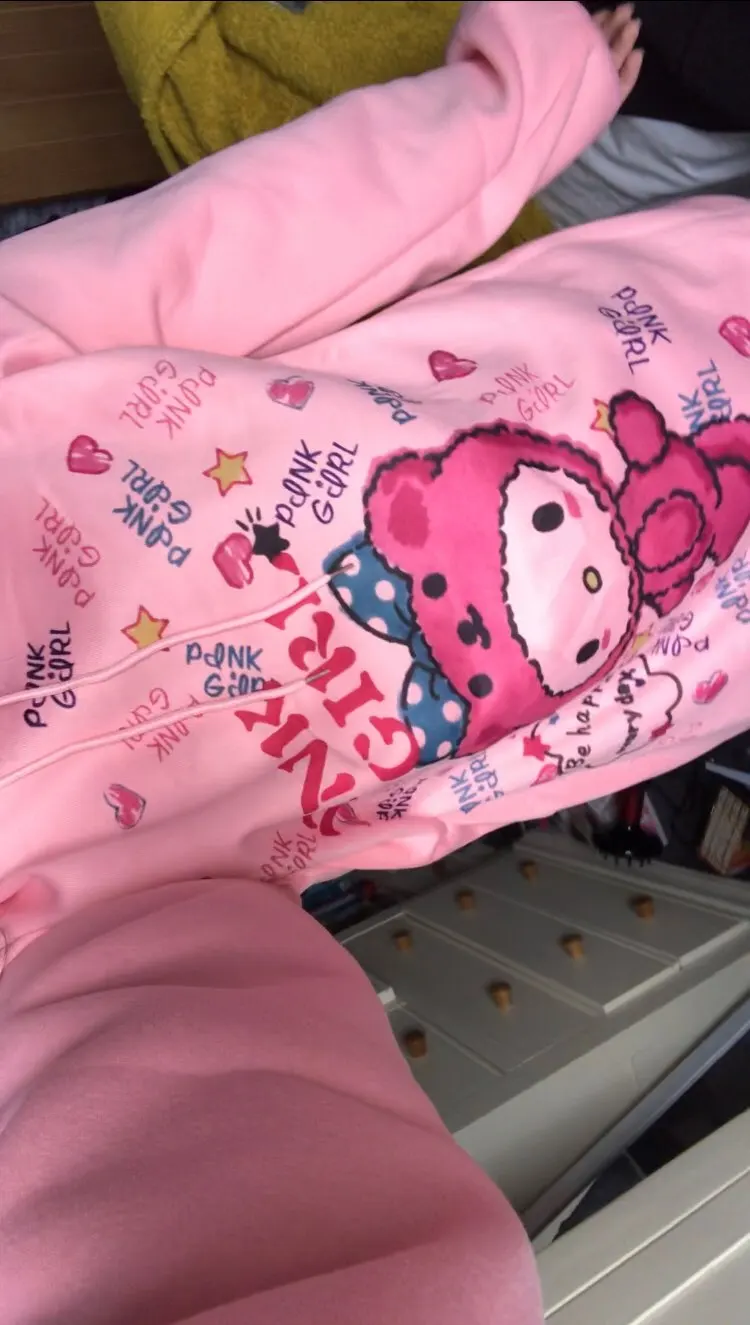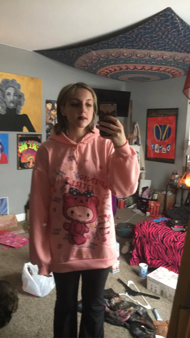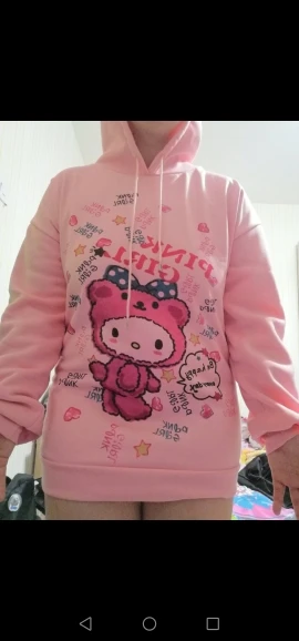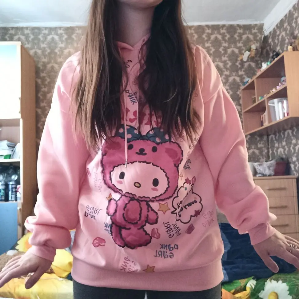 милое худи, красивый цвет, рисунок впечатан в ткань (не наклейка) внутри есть небольшой начесик, но не думаю что в нем будет достаточно тепло. торчащие нитки не заметила, но главный минус это пятно на правом плече, не знаю отстирается или нет :< заказывала 30.01.21, пришло насколько я поняла 22.02.21