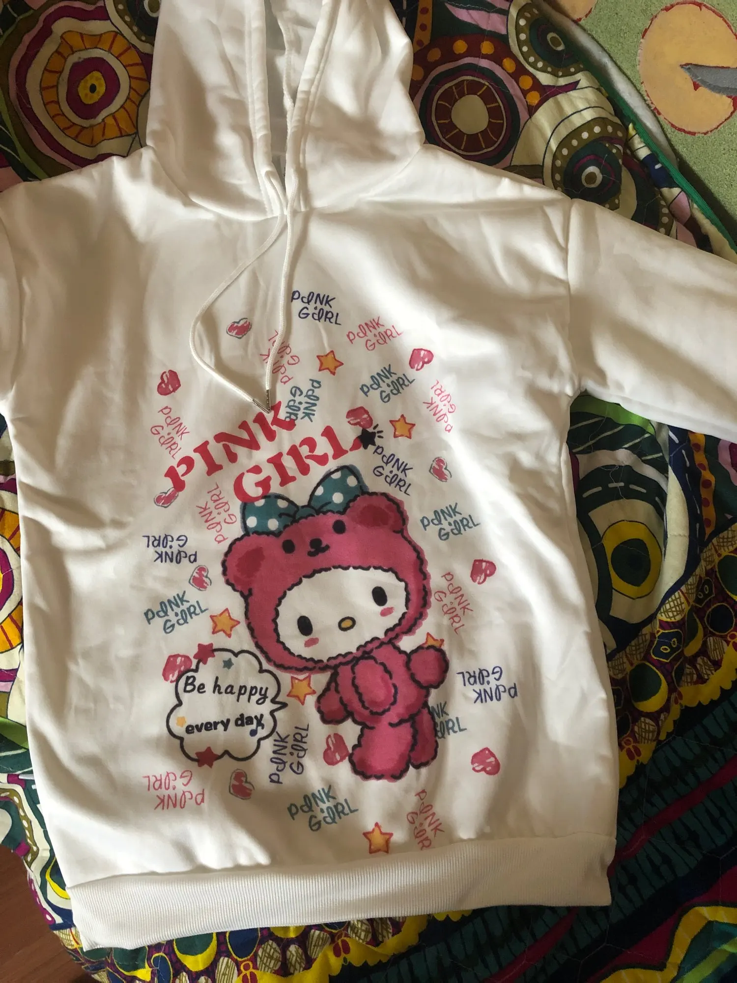 Немного жесткий и дешевый материал, но цвета и изображения Действительно милые, а джемпер удобный, он также немного тонкий, но мне нравится в любом случае, довольно точный продукт по сравнению с waht я думал, что получу :)