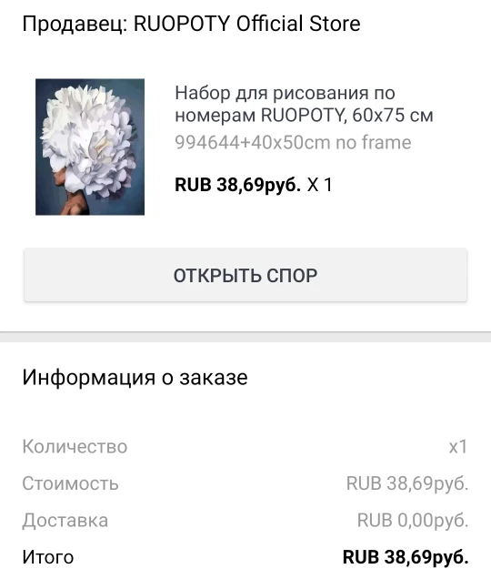 Ухватила кртину на 11.11 за 0.50$, думала продавец не отправит. Но он отправил, получила 18.12 укрпочтой. Продавцу огромное спасибо, что свернул картину на поролоновый валик, а не сложил в несколько раз. Полотно без заломов, в наборе краски, кисти и фурнитура для крепления картины. Красок 24 шт, все свежие, яркие. Заказом очень довольна, продавец ответственный, магазин рекомендую