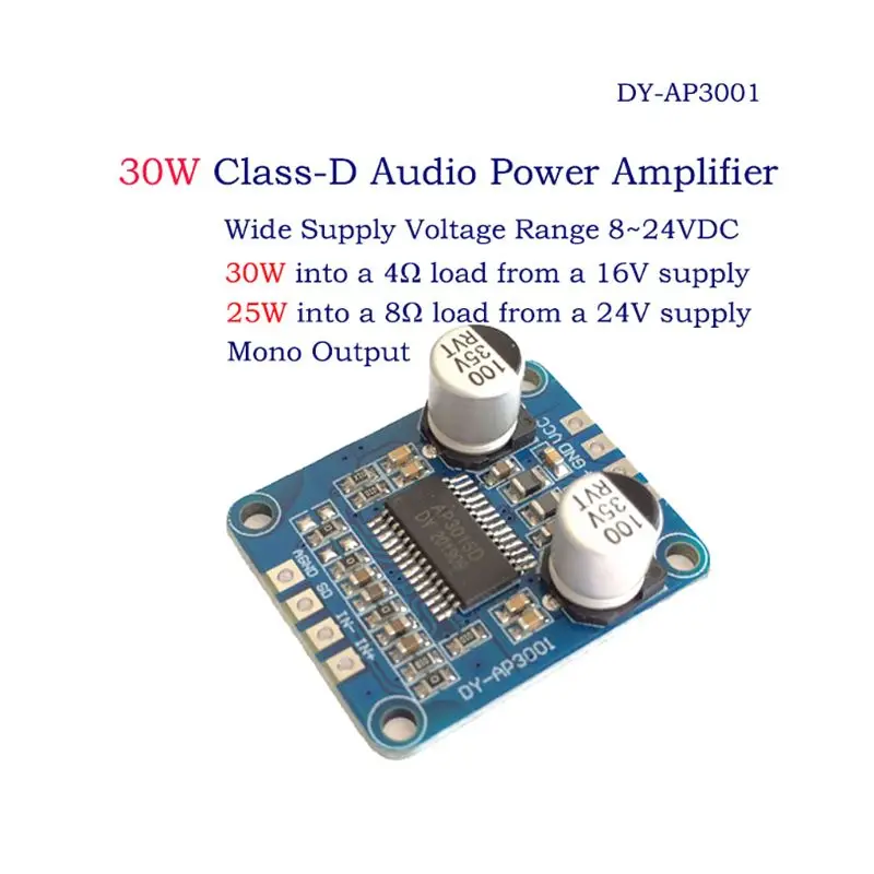 100% новый и высокое качествоOOTDTYОсобенности:DY-AP3001-это мощный Моно-аудио модуль Bluetooth. Одноканальный выход аудиосигнала. Встроенный модуль усилителя, поэтому он может подключаться к громкоговорителю напрямую. Он идеально подходит для динамиков и транспондеров DIY.Ширина Диапазон рабочего напряженияПрименимо несколько типов динамиковПоддержка включенного/отключенного выхода.Спецификация:Модель: DY-AP3001Рабочее напряжение: 8-24 В постоянного токаРежим работы: Класс DКанал: моноВход: аудио входВыходная мощность:Выход мощность 30 Вт при 16V 4ohmВыход мощность 20W 12V 4ohmВыходная мощность 10 Вт при 12 В 8 ОмВыходная мощность 15 Вт при 16 в 8 ОмВыход мощность 25W 24V 8ohmСпикер (30 Вт ~ 300 Вт):4ohm на 8V ~ 16В8 Ом при 8 В ~ 24 ВРабочая температура:-40 ℃ ~ 85 ℃Рабочая влажность: 0% ~ 95% относительной влажностиРазмеры: 2,2x2,6 см (0,87 х 1.02in)Количество: 1 шт.Примечание:1. Нет розничной упаковки.2. Допускается погрешность в 0-1 см из-за ручного измерения. Пожалуйста, убедитесь, что вы не возражаете, прежде чем сделать ставку.3. Из-за разницы между различными мониторами изображение может не отражать фактический цвет изделия. Спасибо!4. Только модуль усилителя, другие аксессуары на фото не включены.Посылка включает в себя:1 шт. x модуль усилителя