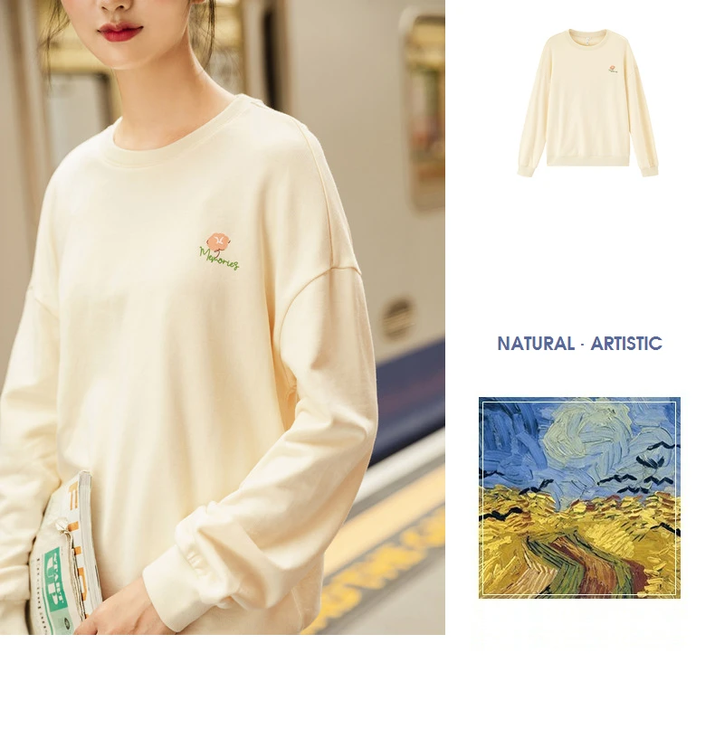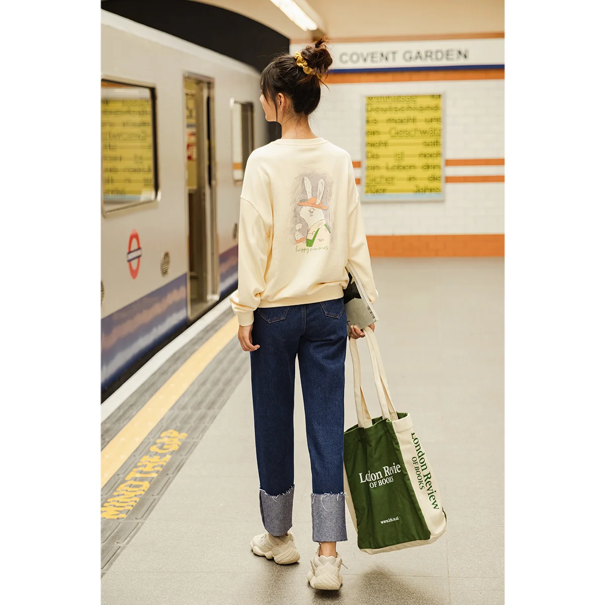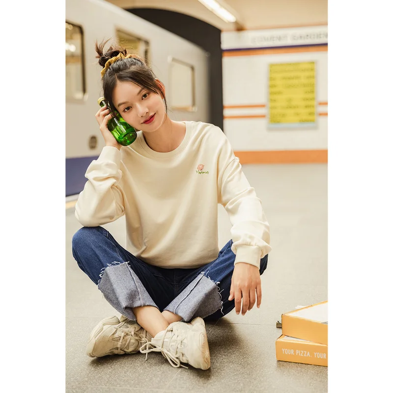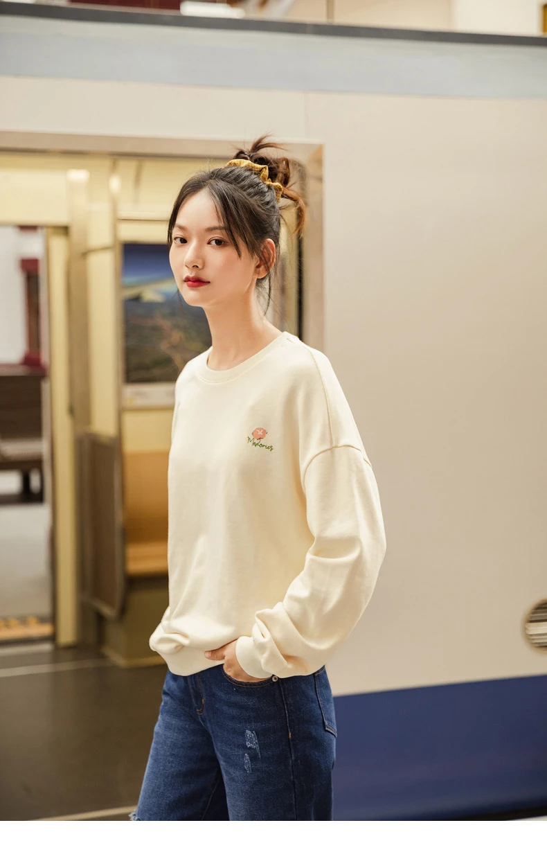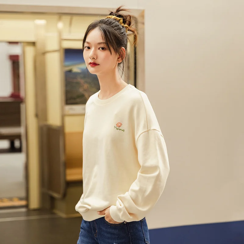 Пуловер женский из чистого хлопка с длинным рукавом и мультяшной вышивкой
