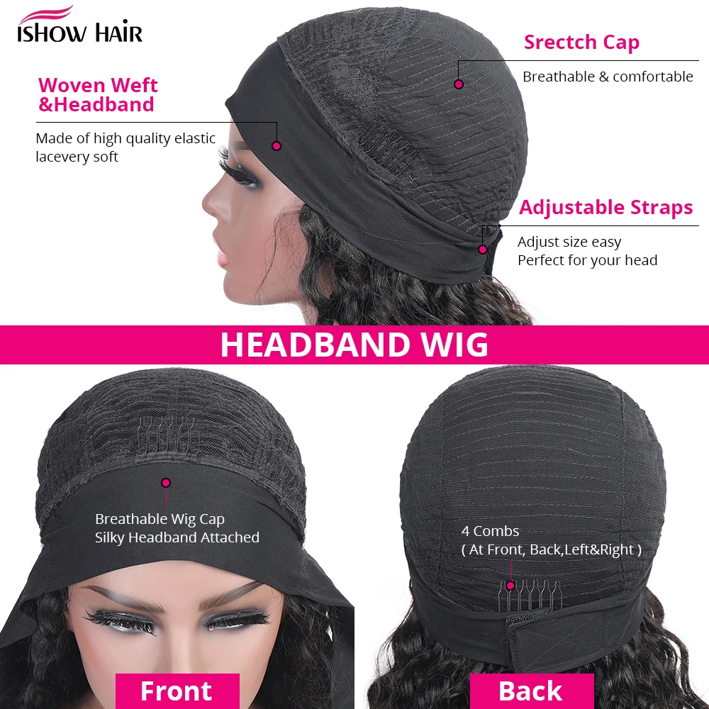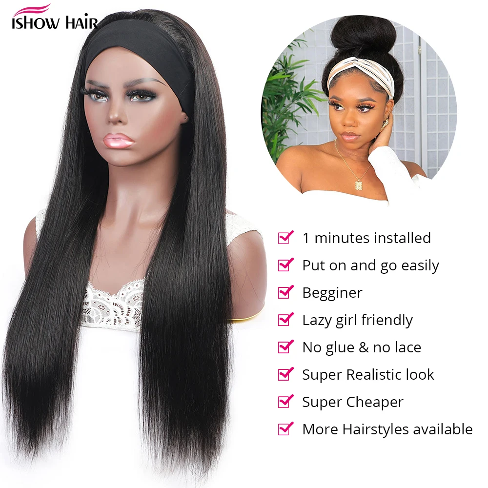Парики Ishow из парик с головной повязкой натуральных волос для чернокожих женщин, полностью машинно изготовленный парик, прямые бразильские волосы без клея, манекен для шарфа парика